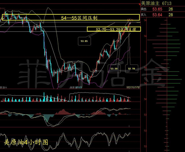 原油現(xiàn)價(jià)53.65附近,油價(jià)上行承壓,運(yùn)行背離。