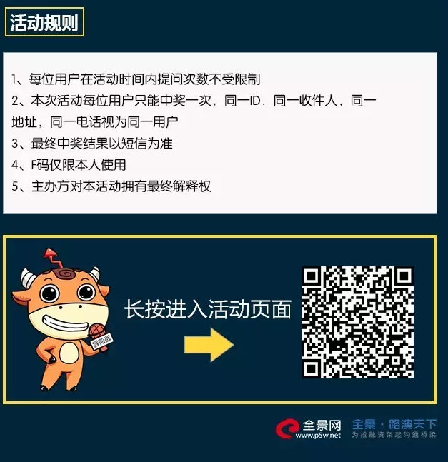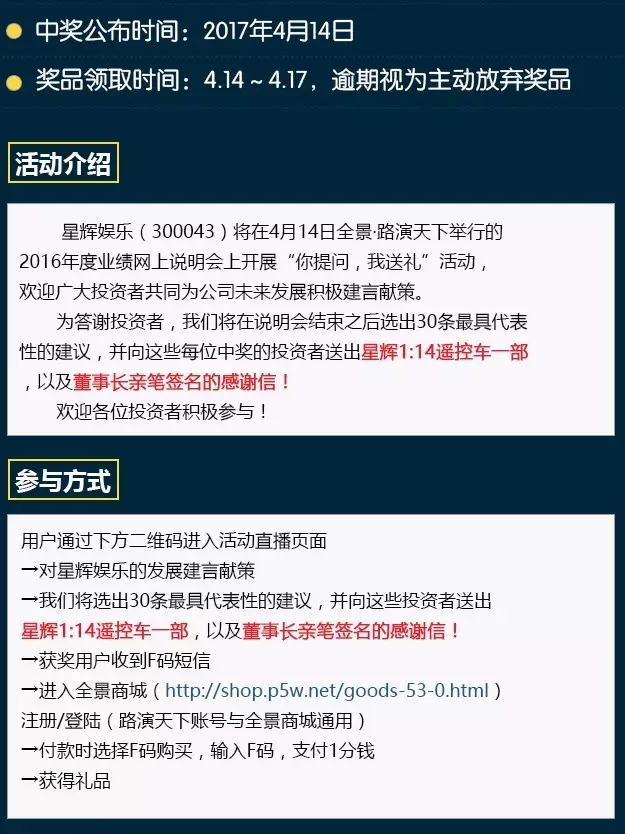 掃描上圖二維碼,或者點擊“閱讀原文”可直接進入活動頁面,【星輝娛樂2016年度業績網上說明會】 全景網(www.p5w.net )創始于1999年,網上路演的開創者和標準制定者。作為資本圈路演互動高端服務平臺,全景·路演天下(rs.p5w.net)及微信號(Roadshow_ly )主要提供路演直播等信息服務,旨在為投融資架起溝通橋梁,經過不斷探索和努力,獲得資本市場各方的厚愛和尊重,品牌號召力及市場影響力與日俱增。近期發現,市場上有以“路演天下”為名號的企業或名義開展商業活動,在此聲明未經我司授權,一概與我們無關,敬請廣大忠實用戶辨明區分,注意風險!
