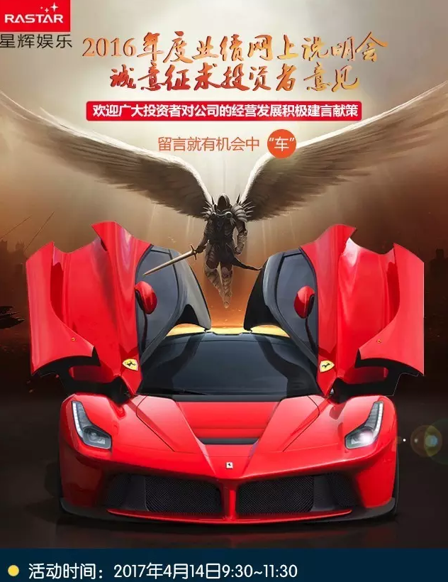 尊敬的投資者: 告訴你們哈,做完這條微信,路演君今晚有件大事要完成! 什么大事啊? 路演君要去提車! 什么車? 跑車, 法拉利, 蝶翼門! 壕不? 重要的是, 今晚提的不是一輛,是30輛! 最最重要的是~~遙控的! 想讓路演君帶上您兜風? 怕坐不下吧,您還是自己要一輛,好嗎? 明天,4月14日 星輝娛樂為所有在當天參與他們2016年度業績說明會的投資者們準備了30份小禮物,1:14的遙控版法拉利!