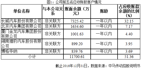 近日,浙江中馬傳動股份有限公司(以下簡稱“中馬傳動”)提交了首次公開發(fā)行招股說明書,公司擬公開發(fā)行不超過5333萬股,發(fā)行后總股本不超過21332萬股,擬募集資金約7.83億元。其中,約3.42億元用于建設新增年產(chǎn)12萬臺六檔手動變速器技改項目,約1.57億元用于新增年產(chǎn)250萬件汽車油泵軸齒輪技改項目的建設,新增年產(chǎn)550萬件汽車轉向器齒輪技改項目投資約1.29億元,此外,投資5450萬元建設汽車自動變速器研發(fā)中心。剩下的募集資金約1億元用于補充營運資金。 通過招股說明書披露的信息,股市動態(tài)分析周刊記者注意到,中馬傳動近三年來的業(yè)績表現(xiàn)平平,營收和營業(yè)利潤持續(xù)下滑,凈利潤整體也呈現(xiàn)下滑趨勢。另外就是公司對于長城汽車的依賴度非常高,僅長城汽車一家就占據(jù)公司銷售額的近30%,與此同時,長城汽車也占據(jù)著公司32.15%的應收賬款總額,超過同期第2-5名客戶的總和。重重跡象表明,中馬傳動的經(jīng)營隱患很大,上市后是否能良好表現(xiàn)并給予中小股東穩(wěn)定回報有待時間的驗證。 凈資產(chǎn)收益率快速下降 依據(jù)招股說明書公布的財務數(shù)據(jù),公司2014年至2016年的加權平均凈資產(chǎn)收益率分別為27.62%、15.77%、13.08%。趨勢呈現(xiàn)出逐年下降,并且2016年的凈資產(chǎn)收益率水平不及2014年的一半。 同時,查閱可對比上市公司的數(shù)據(jù)后發(fā)現(xiàn),精鍛科技2014年至2016年的凈資產(chǎn)收益率數(shù)據(jù)分別為11.13%、11.36%、10.15%,萬里揚2014年至2016年凈資產(chǎn)收益率的數(shù)據(jù)分別為9.15%、9.46%、11.81%,雙環(huán)傳動2014年至2016年的凈資產(chǎn)收益率數(shù)據(jù)分別為8.16%、8.50%、6.34%。從以上數(shù)據(jù)計算出精鍛科技、萬里揚、雙環(huán)傳動2014年至2016年的行業(yè)凈資產(chǎn)收益率平均為9.48%、9.77%、9.43%。 不難發(fā)現(xiàn),即使公司的凈資產(chǎn)收益率水平在2015年大幅下降11.85個百分點,但是依然明顯高于行業(yè)的平均水平。從上面的數(shù)據(jù)也可以發(fā)現(xiàn),行業(yè)其他公司的凈資產(chǎn)收益率一直表現(xiàn)比較穩(wěn)定,雖有小幅波動,但屬于正常現(xiàn)象。而中馬傳動的這一數(shù)據(jù)表現(xiàn)很值得讓人玩味。 帶著這一疑問,股市動態(tài)分析周刊記者有以郵件的形式對中馬傳動進行采訪,截止發(fā)稿,公司未對此進行回復。 業(yè)績下滑趨勢較明顯 2014年至2016年,公司主營業(yè)務收分別為100321.82萬元、88993.01萬元、81055.82萬元,2015年和2016年主營業(yè)務收入在上年基礎上的降幅分別為11.29%、8.92%。營業(yè)利潤分別為30220.87萬元、23861.55萬元、22497.78萬元,2015年和2016年營業(yè)利潤分別在上年的基礎上減少21.04%、5.72%。凈利潤分別為15927.58萬元、9961.57萬元、10485.79萬元,2015年凈利潤下滑37.46%,2016年凈利潤增長5.26%,2016年凈利潤增長的主要原因在于2016年的財務費用比2015年減少722.72萬元,并非是業(yè)務擴張產(chǎn)生的結果。從以上數(shù)據(jù)可以看出公司整體經(jīng)營業(yè)績呈下降趨勢。 雙環(huán)傳動2014年至2016年的營收分別增長27.80%、10.34%和24.72%;營業(yè)利潤分別增長78.43%、9.96%、29.06%;凈利潤分別增長81.73%、11.81%和35.84%。萬里揚2014年至2016年的營收分別增長-3.04%、42.74%和89.20%;營業(yè)利潤分別增長33.29%、4.10%和49.60%;凈利潤分別增長31.59%、10.50%和47.53%。精鍛科技2014年至2016年的營收分別增長18.02%、11.30%和28.66%;營業(yè)利潤分別增長4.69%、14.90%和35.48%;凈利潤分別增長2.92%、11.43%和36.28%。 以上數(shù)據(jù)表明,行業(yè)可對比公司的業(yè)績近年來呈現(xiàn)的是增長趨勢,而中馬傳動的業(yè)績卻呈現(xiàn)的是較明顯的下滑趨勢。 2015年中國汽車產(chǎn)銷比上年分別增長3.3%和4.7%;2016年中國汽車產(chǎn)銷比上年同期分別增長14.5%和13.7%,高于上年同期11.2和9.0個百分點。下游整車行業(yè)依然保持增長。可以看出公司主營業(yè)務的下滑與行業(yè)整體環(huán)境并無關系。 那么,公司是否在經(jīng)營中出現(xiàn)重大失誤而被隱瞞?公司并未對記者的采訪進行回復說明。 高度依賴長城汽車 從招股說明書中披露的數(shù)據(jù)可以發(fā)現(xiàn),公司對于長城汽車的依賴度非常高,僅此一家客戶的銷售額就占據(jù)公司銷售總額的近30%;同時長城汽車占據(jù)了公司32.15%的應收賬款總額,超過同期第2-5名客戶的總和。(見圖1)