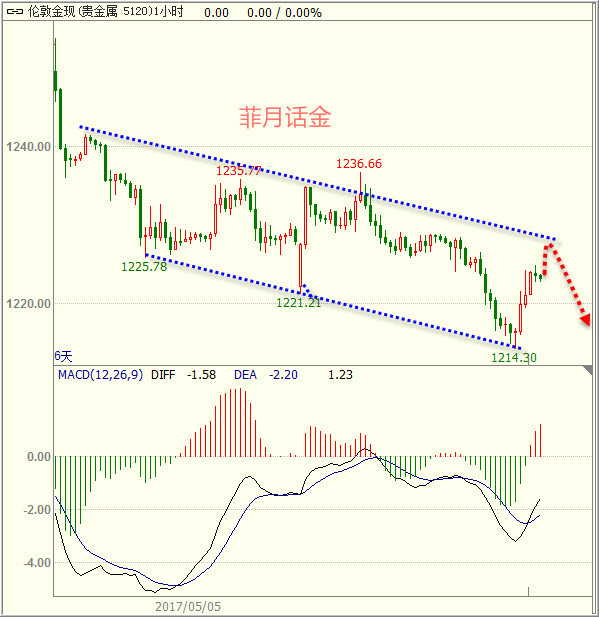 黃金昨日如預期再次下跌,黃金的下跌中長線方向不變的,短線技術性反彈是無力的強勢美元成就了黃金不斷的向下,技術上1213區域強支持但突破反彈至1224區域,短線30分鐘五浪下跌結束反彈強勁的反彈是正常的,但這種反彈沒有改變下跌趨勢線,日線陰線短線反轉需要時間和空間以及能量的配合如果沒有能量配合還是震蕩下行為主。 如預期再次下跌至1213區域此位置是1小時下跌阻力線位置同時也是內切趨勢線所以晚間開始強勢反彈至1224區域,但上方壓力位1225-27區域,成位置是前期突破后多頭成交密集區域,短線突破這里才是多頭機會,今日反彈后高空為主。