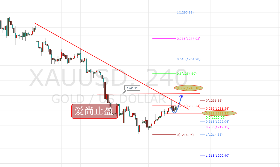昨日,黃金在早間小幅回撤之后走反抽,午后最高觸及1233附近后受阻回落,歐盤在回撤1229一線后再次上行,美盤時段,黃金最高沖擊1237后受阻回落,1237一線,本人昨日強調過,此位,是4小時級別的趨勢線壓制,也是上周的高點阻力,昨日晚間,我們VIP群在1236一線做空,也是小有盈利。 今日,上方壓力繼續關注4小時下降趨勢線1235-36壓制,強壓力關注1295-1214回撤反抽0.382對于的1245,下方支撐關注1214-1237上升回撤0.382對于的1228一線,強支撐1223。黃金在昨日收陽破高之后,金價收于日線5/10日均線之上,目前短期均線已經完成初步的阻力與支撐的轉換,日線短期均線之上,就需以逢低做多為主,當前,日線5/10日均線支撐位于1227附近,上升回撤的0.382位置位于1228一線,那么,做多的話,最好的位置,就在1228一線,日內黃金觸及此位可多,上方目標看至4小時趨勢線壓制1235,有效突破后看1240-42。 操作策略: 1228附近多,止損1223,目標看1235-41 |