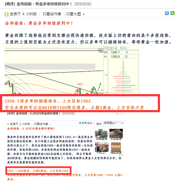 金偉指南:黃金多單持續(xù)獲利中! 黃金自趨勢線受到支撐后出現反彈,美盤開盤前后黃金出現一輪上漲,但是這個上漲力度也不大,日內亞盤震蕩運行,歐盤下跌,美盤的急速上拉很可能是一個誘多的行情,而且1263一線附近屬于一個壓力的區(qū)間,不破那么黃金可能形成頭部而且會初選比較大的回落,技術面上來看小級別均線逐漸走平,附圖上MACD動能不足,快慢線零軸上方走平,KD超買區(qū)即將粘合,綜合來看黃金上漲動能不足,就算是快速上漲,那么也是需要一輪回落來修復技術指標. 1258.7做多單的目前已經獲利3美金,穩(wěn)健的可以先行止盈離場。 上不破1263那么可以先1262.5附近做空,下方目標1257附近,破位看1253. |