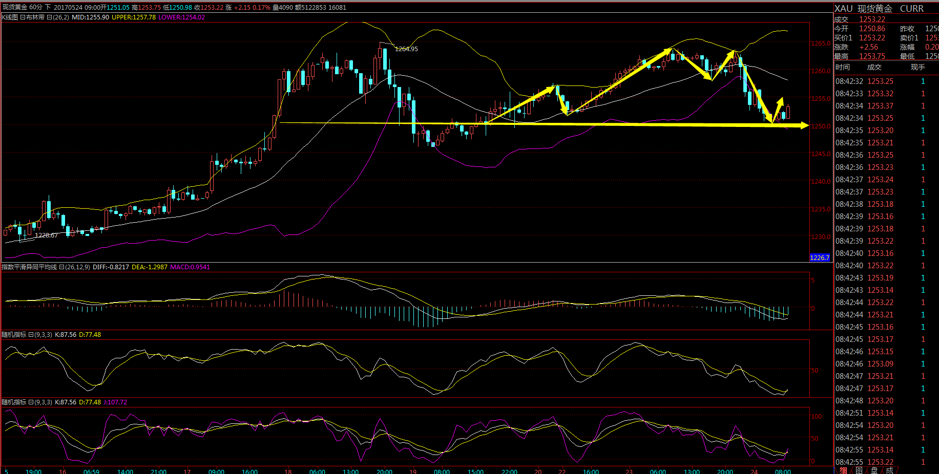 肖禮勇:5.24黃金暴跌.多頭似乎疲憊 黃金消息面: 黃金為何暴跌:北京時間周二晚間,特朗普政府正式公布其2018財年預(yù)算案細(xì)節(jié),計劃未來十年內(nèi)削減支出3.6萬億美元,并尋求通過銷售戰(zhàn)略石油儲備來增加收入。由于此前媒體已經(jīng)透露了大部分細(xì)節(jié),所以并沒有引發(fā)市場太大的反應(yīng),美元指數(shù)一度短線上漲,刷新日高至97.35。黃金價格受挫暴跌至1251。 黃金技術(shù)面: 日線圖上看,黃金踩住5日線進(jìn)一步收陽上升,結(jié)合1246打底回升。剛好是確認(rèn)5日線支撐回穩(wěn)。形成每日10美元左右的上升收復(fù)。目前價格重新回到1263關(guān)口,上周首次觸及出現(xiàn)一次回調(diào)。針對上漲浪形的回調(diào)蓄勢,再次靠近就是沖著破高而去。日線圖經(jīng)過回踩后均線帶動向上構(gòu)造支撐。短線具備一定上行動能。突破1264高點(diǎn)只是時間的問題。4小時1214至1264.8一浪上漲得到回調(diào)緩解,而上周踩住1246守穩(wěn)反彈。那么新的浪形在蓄勢沖高,那就是1246作為二浪起漲點(diǎn)在發(fā)力。按臺階上漲通道來看,二次回踩不能再靠近1250.這樣多頭才算強(qiáng)勢。而突破1264.8高點(diǎn)就顯得輕松得多。今日操作依托昨日低點(diǎn)1251做臨界點(diǎn)回踩繼續(xù)做多。短線上方看至1262。整體區(qū)間操作為主,上方頂點(diǎn)壓制1263附近。 黃金操作建議: 1250多單進(jìn)倉.止損默認(rèn)。目標(biāo)看1255一線。 肖禮勇寄語: 國家理財規(guī)劃師。交易心得:根據(jù)交易定律法則,盡量規(guī)避不確定性帶來的無謂止損,耐心的等待風(fēng)險小利潤大的機(jī)會,這里不缺少機(jī)會,缺的只是等待機(jī)會并贏得機(jī)會。市場永遠(yuǎn)是對的,沒有比市場更精明 肖禮勇:扣2494314628 |