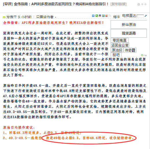 金偉指南:EIA之前,原油先賺一波! 原油亞盤在48.8一線震蕩,最高觸及49美金一線,達到49.04. 早間金偉指南給出的49美金空單,目標看到48.6。,破位繼續持有! 目前原油短線急跌,最低來到48.375美金!建議空單現價48..395美金獲利0.6美金出局! 恭喜跟上的朋友!激進的朋友可以繼續持有看新低! |