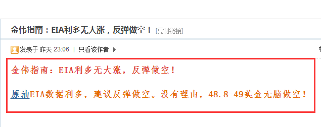 金偉指南:原油無腦反彈空單已賺1.2美金,多單被套請看這里! 昨日晚間原油EIA利多,數據出來后做多,或者提前布局多單,沒問題,肯定賺錢!但是突破49美金收割第一波利潤后還追多,那只能說你太不理智! 金偉指南在EIA之前就已經在文章中說過,原油反彈做空,在早間的文章中,布局的49美金空單也完美獲利0.6美金。在數據出來后,金偉指南認為,油價不會大漲,也就49美金到底,最多不會超過49.2-49.3一線,所以在市場普遍追多看到49.5美金的情況下,在49美金一線布局反彈空單。沒有理由,無腦做空,就是要做空! 也許你會說,看技術指標你需要繼續追多。但金偉指南要說的是,純粹看技術的人,早已死在做投資的起跑線上。不要問金偉指南為什么做空,金偉指南多年的檢驗以及對市場的認知告訴金偉指南,反彈空!必須空!無腦做空!想具體知道原因,關注金偉指南微 信,為你解惑! 實時證明,我是對的!油價最高到達49.14,震蕩兩小時后,再次暴跌,最低至47.88,跌幅多達1.2美金之多! 恭喜跟上金偉指南空單布局的朋友,0.73美金的利潤輕松到手!追多看到49.5美金的,歡迎關注金偉指南微 信,在線為你免費提供最佳解套策略! 目前原油在48美金一線震蕩,空單還持有的朋友建議獲利0.73美金平倉,等待下一波進場時機!金偉指南在線為你提過日內操作良策,歡迎咨 詢! |