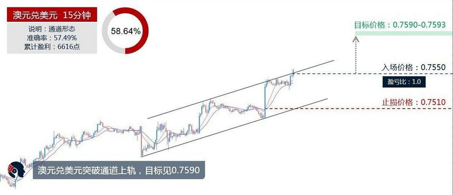 | 圖為澳元兌美元15分鐘走勢,價格突破通道上軌,通道形態破位。 根據通道形態的規則,預期上漲目標見0.7590(形態的一倍高度,允許誤差3個點)。 均線交叉系統處于看漲狀態,RSI數值上漲至71.67。 澳元兌美元突破通道上軌,目標見0.7590 澳美現價0.7550多單,止損0.7510,止盈0.7590 |