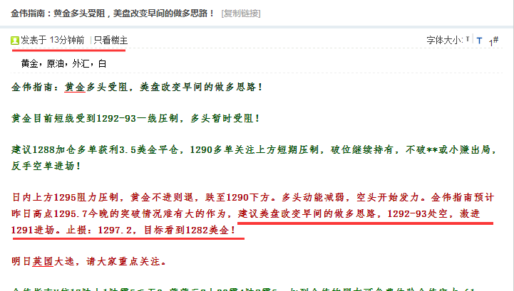 金偉指南:黃金多頭受阻回撤,美盤(pán)震蕩空! 凌晨黃金第一次測(cè)試1295.7,今日早盤(pán)黃金第二次測(cè)試1295高點(diǎn),歐盤(pán)在這兩條下降趨勢(shì)線連線1293.5見(jiàn)頂。持續(xù)不破則回落。較大陰線跌破1290關(guān)鍵支撐,卻在昨日1287.5低點(diǎn)處受到支撐小幅反彈。金偉指南認(rèn)為美盤(pán)黃金是震蕩偏空的。因?yàn)榧夹g(shù)上黃金1295.7-1295-1293.5高點(diǎn)降低,小趨勢(shì)處于震蕩偏空走勢(shì),歐破底,美反彈空。美盤(pán)前1288多單小賺出局,隨后給出的1291.5美金空單,現(xiàn)價(jià)1289.7,空單開(kāi)始獲利! |