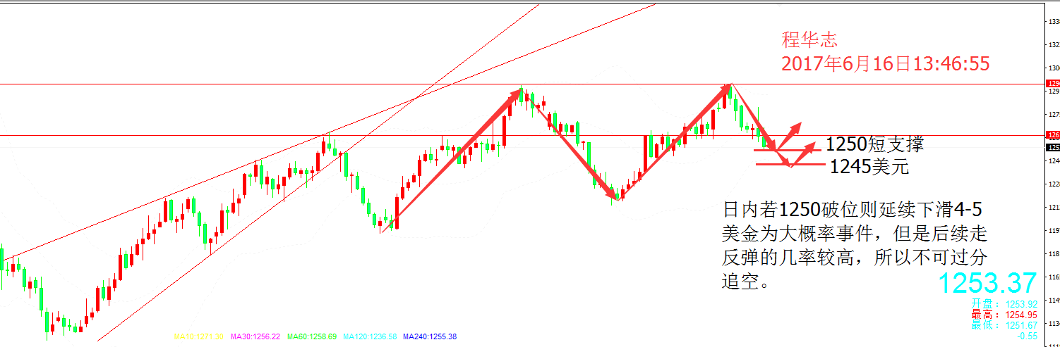 價格密集盤整之后的突破,通常是值得冒險的交易機會。 市場消息面解讀: 美聯儲實施金融危機以來的第四次加息舉措,雖然這符合場普遍預期。但是在數據公布之后美元以及黃金依然出現了短線爆發,其實這主要原因是由于近期通脹數據不及預期,但美聯儲主席耶倫仍然發出較預期更加鷹派的言論,從而讓市場心理出現較大的落差。 經濟數據方面,美國初請失業金人數上周降幅超預期,表明就業市場閑置進一步減少,同時6月紐約聯儲和費城聯儲制造業數據均好于預期。這可能為美聯儲在通脹放緩的情況下,年內再次升息提供理據。美聯儲此前不斷重申,維持其以數據為依據的貨幣政策,表明經濟報告與美聯儲預估一致,是繼續加息的必要條件。 此外,近期華盛頓政治動蕩局面已經對美元構成打壓,而最新的這一份報道重燃政治憂慮,從而抑制美元反彈勢頭。股市也因市場避險情緒升溫而受到負面影響。穆勒檢視妨礙司法可能性一事如陰魂般糾纏,儼然令特朗普再受打擊。特朗普上任后的前五個月,一直壟罩在聯邦調查局與國會通俄調查的陰霾當中。華盛頓政治動蕩局面已經對美元構成打壓,而最新的這一份報道重燃政治憂慮,從而抑制美元反彈勢頭。股市也因市場避險情緒升溫而受到負面影響。 站在市場的角度來看,盡管美國利率水平上升,但金融市場仍存在足夠的不確定性,且地緣政治緊張局勢升溫,這將長期維持黃金的買盤。在估值過高的股票和債券市場上,黃金仍是一種頗具吸引力的資產。這將會為黃金價格帶來不小的買盤支撐。每次回調一直在被買入,因市場繼續在這些水平上看到價值。 國際黃金走勢解析: 一個暗示就能引發市場巨震,這就是金融市場的高風險特性同樣也是魅力所在。在加息靴子落地后,美聯儲主席耶倫一改往常的溫和“鴿聲”露出鷹爪,無視近期疲軟的美國經濟數據暗示通脹回落基本是暫時性的。讓市場心理出現落差缺口,從而激發出短線空頭一輪又一輪的進攻。上個交易日美盤公布出的美國至6月10日當周初請失業金人數表現讓我們不得不認真評估年內美聯儲再次加息的可能性,黃金價格短線收到數據影響上個交易日再次收跌,價格最低觸及1251美元。 從市場心理的角度來看,美聯儲本周的偏鷹表現讓市場慢慢緊張起來,很明顯會將美聯儲的進一步行動納入預期。這對于黃金市場來說無疑相當于打了一個“預防針”。加上下半年各國對黃金的需求會逐步向好,所以對于長線來說,黃金價格會逐步走強。 具體盤面,上個交易日價格跌破1259/1260美元的關鍵支撐最低觸及1251美元一線。短線的弱勢依然在延續,雙頂配合加息利空讓下方支撐不斷下移。目前下方支撐位已經從1270到1263到目前的1250美元一線,連續性的下跌讓短期的各項指標都出現了偏空表現。如果作為市場心理防線1250美元一線繼續被破,那么黃金的筑底時間將會繼續推遲,反之則價格會在短期內得到修正。但是在破位1263美元之前都不能過分看漲,短期按照區間修復的思路來操作即可。 短線重點關注點位: 短線首次反彈見1255-1256美元布局空單,損1260美元下,目標看1250美元一線;若破位有可能延續下滑4-5美元,但是日內站穩1250美元下方的幾率不大。多單布局根據盤面實際情況給出。 聽了很多大道理,可依然做不好交易。學習了很多理論知識,可仍然不能游刃有余。如果我們不貪婪,我們不會被打敗,如果我們不恐懼,我們將獲得勝利,有時候想證明給一萬個人看,但發現最后能懂的只有自己。市場的生存法則就是弱肉強食,注定有一批人將被市場所淘汰。佛度有緣人,我帶有心人。 以上分析不做具體進場點位,僅供參考。投資有風險,入市需謹慎。文章由程華志原創,轉載注明出處。 文/程華志 |