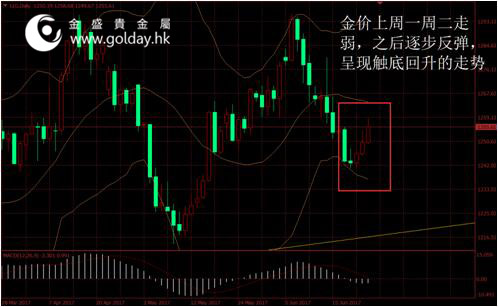 上周現(xiàn)貨黃金開盤1254.80美元/盎司,最高1258.68美元/盎司,最低1240.93美元/盎司,收盤1255.61美元/盎司,全周金價小幅反彈1.26美元,漲幅0.1%。整體來看,金價上周一周二走弱,之后逐步反彈,呈現(xiàn)觸底回升的走勢。消息面上開始有利多出現(xiàn),美元指數(shù)出現(xiàn)回落也對金價有所支撐,資金流出速度放慢,技術(shù)面走勢有所改善。 圖1上周金價走勢 消息面上看,上周公布的數(shù)據(jù)顯示,美國二手房和新房銷售增速均出現(xiàn)回升,但Markit公布的6月制造業(yè)PMI初值再次回落。總體來看,目前美國經(jīng)濟(jì)依然處于擴(kuò)張時期,但是已知的二季度經(jīng)濟(jì)數(shù)據(jù)大部分仍然不如人意,同比來說經(jīng)濟(jì)可能相對穩(wěn)定,但二季度的環(huán)比增速到目前為止加速的可能性較低,我們將持續(xù)關(guān)注這一情況。