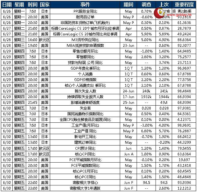 資金面上,全球最大的黃金上市交易基金SPDR Gold Trust的黃金持倉量上周減少2.66噸,此前一周倉位大幅減少13.32噸。CFTC公布的數(shù)據(jù)顯示,截至上周二紐約金非商業(yè)持倉凈多頭持倉數(shù)量為150675張,此前一周持倉量為190274張。期貨和現(xiàn)貨同步減倉,顯示目前投資者趨于謹(jǐn)慎,但減倉幅度下降表明多頭氣氛開始好轉(zhuǎn)。 圖3紐約黃金期貨持倉情況 技術(shù)面上看,金價在1300美元附近遇阻之后持續(xù)回落,符合我們此前的預(yù)期,金價在1240美元上方開始企穩(wěn)反彈,表明多頭暫時穩(wěn)定住局勢。上方壓力位則仍需持續(xù)關(guān)注1295美元至1300美元整數(shù)關(guān)口附近,再下一個中期壓力位則在1330美元附近。支撐位位于下方1234美元附近,1200美元則有較強(qiáng)支撐。目前空頭力量已經(jīng)宣泄完畢,金價初步持穩(wěn)反彈可期,但消息面有所配合之前也不應(yīng)盲目樂觀。長期來看暫維持寬幅震蕩觀點(diǎn),以等待基本面的變動。 我們認(rèn)為,近期金價的走勢已經(jīng)基本將前期重要,包括美聯(lián)儲年內(nèi)第二次加息的趨勢性在內(nèi)的事件計入價格。但上文也已經(jīng)提到,目前市場和美聯(lián)儲的預(yù)期仍有差別,未來如果美聯(lián)儲減持當(dāng)前緊縮路徑不變,則可能在某些階段市場調(diào)整會較為劇烈。此外,當(dāng)前美聯(lián)儲官員給定的縮表路徑,在持續(xù)增加每個月縮減量之后,最終MBS減持量將占月成交量的10%左右,會對市場造成較強(qiáng)烈的影響,這一情況可能在明年年底出現(xiàn),屆時我們將再次關(guān)注。 本周公布的重要數(shù)據(jù)包括:美國PCE物價指數(shù),日本通脹數(shù)據(jù)等。此外,中東地區(qū)政治局勢需要繼續(xù)持續(xù)關(guān)注。 |
