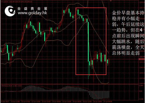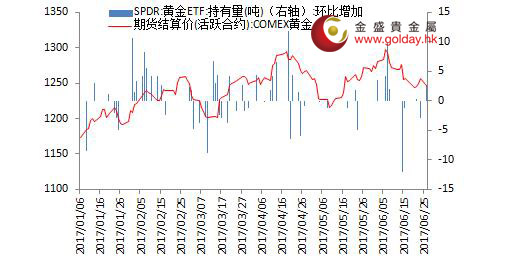 上一交易日現貨黃金開盤1256.96美元/盎司,最高1257.82美元/盎司,最低1236.64美元/盎司,收盤1244.38美元/盎司,收盤大跌11.23美元,跌幅0.89%。日內來看,金價早盤基本持穩并有小幅走弱,午后延續這一趨勢,但在4點前后出現瞬間大幅跳水,隨后震蕩橫盤,全天總體明顯走弱。美元指數有所走強,消息面對金價影響較小,現貨市場資金有所流入,技術面走弱有限。 圖1黃金價格走勢 消息面上看,美國5月份不含飛機的非國防資本品訂單下降0.2%,弱于預期的為增長0.4%,整體耐用品訂單下降1.1%,降幅幾乎為預期的兩倍,表明資本品投資降溫料拖累二季度經濟增速。此外,美國5月份芝加哥聯儲全美活動指數和6月份達拉斯聯儲制造業指數均遜預期。結合前期數據看,至少截止到5月美國經濟擴張速度的回升不及市場預期,這對金價運行趨勢偏多。 此外,美國最高法院恢復部分特朗普旅美禁令,法官們在一份無簽名的意見中表示,禁止主要人口為穆斯林的六國公民進入美國的行政命令現在可以全面實施,除非相關人等可以證明自己與美國的個人或實體有可信的誠善關系。這或意味著特朗普與部分其他官員可能達成某種交易,未來推行政策受到的阻力可能將減小,對金價不利。 歐洲方面,歐央行行長德拉吉捍衛寬松立場,稱歐元區經濟復蘇利于青年人就業,央行的最佳政策路徑是維持激勵政策直至經濟恢復穩定,表明其仍在向市場傳遞近期不會結束寬松的信號。但是隨著QE標的幾乎被歐央行全部購買,未來政策施展空間十分有限,我們仍預計下半年歐央行將推出QE并且不排除加息的可能性。