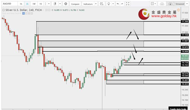 下方支撐:1249.80-1248.90、1244-1245.30 白銀技術分析: 現貨白銀周三(6月28日)亞盤和歐盤震蕩上行,偏高位震蕩,美盤基本延續這種走勢。上方關注16.90、16.97-17.06和17.30-17.45美元/盎司區間的阻力。昨天說過不太建議在16.67-16.77區間做空,做多最好等上破16.77,上方空間打開的。下方關注16.74-16.70、16.57-16.53、16.48-16.42和15.65-15.75美元/盎司的支撐,回調該位置繼續做多。 白銀操作建議: 上方阻力:16.90、16.97-17.06、17.30-17.45 下方支撐:16.70、16.57-16.53、16.48-16.42、15.65-15.75 今日重要數據: 20:30 美國至6月24日當周初請失業金人數(萬人) 20:30 美國第一季度實際GDP年化季率終值 20:30 美國第一季度實際個人消費支出季率終值 21:45 美國至6月25日當周彭博消費者信心指數 22:30 美國至6月23日當周EIA天然氣庫存(億立方英尺)