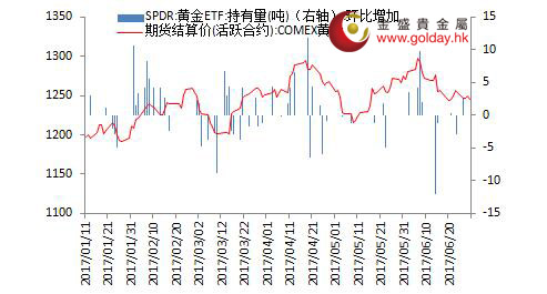 上一交易日現貨黃金開盤1248.99美元/盎司,最高1253.0254.49美元/盎司,最低1239.65美元/盎司,收盤1245.14美元/盎司,收盤小幅下跌3.82美元,跌幅0.31%。日內來看,金價早盤略有拉升,之后持續維持震蕩走勢,午后出現大幅回落,晚間以偏弱震蕩為主,全天總體呈現小幅回落。美元指數進一步回落,消息面并無短期利空,主要現貨投資者資金量不變,技術面上短期或以震蕩為主。 圖1黃金價格走勢 消息面上看,昨日公布的數據顯示美國第一季度GDP環比折年率增幅終值自1.2%上修至1.4%,受消費和貿易提振。GDP上修的情況超出市場預期,但平減指數向下修正,顯示通脹回升速度依然不快。美聯儲方面,圣路易斯聯儲行長Bullard重申當前利率適當的觀點,并認為在9月做出收縮資產負債表決定的可能性大于7月,縮表不會攪動市場。我們認為,上述變動可能將令9月美聯儲加息的迫切性降低,支持了9月宣布開始縮表并在12月開始加息的可能性,這對金價并非利空,但經濟走強對金價市中長期的利空。 另外,美國財長努欽稱,當特朗普政府官員9月份同國會領導人拿出一份共同的稅收計劃時,將做到完全透明,這可能暗示8月國會休會之前特朗普政府的稅改計劃可能難以通過。我們認為,市場的“特朗普交易”的情緒回落,對金價也是偏多的。 歐洲方面,德國6月份通脹率意外加速,從1.4%升至1.5%,讓正在思考撤出量化寬松政策的歐洲央行官員們松了一口氣。此前歐央行行長德拉吉偏鷹派的講話曾引起市場震動,雖然隨后予以澄清,但是我們認為9月歐洲央行將迎來貨幣政策的轉向,即使沒有直接加息,也將明確指出未來收緊的方向,歐元上行趨勢將進一步鞏固,美元指數將受壓制,對金價有一定支撐。