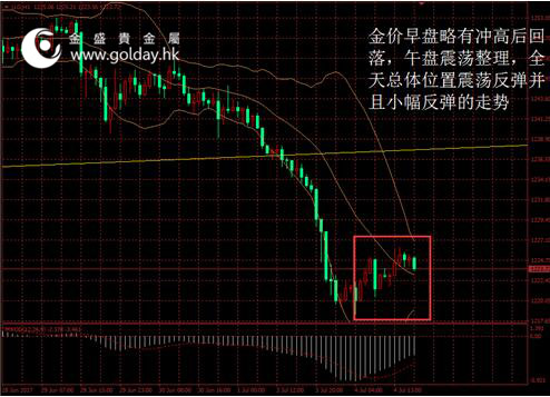 今日現(xiàn)貨黃金開(kāi)盤(pán)1220.14美元/盎司,截至北京時(shí)間下午5點(diǎn)30分,最高價(jià)格為1226.34美元/盎司,最低價(jià)格為1220.14美元/盎司。日內(nèi)來(lái)看,金價(jià)早盤(pán)略有沖高后回落,午盤(pán)震蕩整理,全天總體位置震蕩反彈并且小幅反彈的走勢(shì)。美元指數(shù)也震蕩上漲,技術(shù)面沒(méi)有進(jìn)一步走弱。 圖1金價(jià)日內(nèi)走勢(shì) 消息面上看,日內(nèi)較為清淡。韓國(guó)軍方表示,朝鮮從西部地區(qū)發(fā)射一枚彈道導(dǎo)彈,之后落入其東海岸外海。另外有消息稱(chēng),該導(dǎo)彈為洲際導(dǎo)彈,射程可達(dá)美國(guó)本土。此事件在本周稍晚G20領(lǐng)導(dǎo)人將在德國(guó)召開(kāi)峰會(huì)前發(fā)生,不排除屆時(shí)各國(guó)可能商討對(duì)朝鮮的制裁和其他反制措施。但截至目前為止,避險(xiǎn)情緒尚未明顯升高,也沒(méi)有對(duì)金價(jià)產(chǎn)生明顯影響。該事件后續(xù)情況我們將持續(xù)關(guān)注。 市場(chǎng)層面看,日本股市震蕩收跌,受朝鮮發(fā)射導(dǎo)彈相關(guān)消息打擊,日本股市人氣惡化,日經(jīng)指數(shù)跌0.1%至20032.35點(diǎn)。中國(guó)股市小跌結(jié)束三連升,藍(lán)籌股繼續(xù)調(diào)整,上證綜指收?qǐng)?bào)3182.80點(diǎn),跌13.11點(diǎn)或0.41%。香港股市收低創(chuàng)12月中以來(lái)單日最大跌幅,恒生指數(shù)收跌1.5%至25389.01點(diǎn)。匯率方面,日元對(duì)美元上漲,歐元小幅回落,美元指數(shù)午后振幅擴(kuò)大,總體有所上行。國(guó)際能源價(jià)格美國(guó)假日來(lái)臨前回落,結(jié)束連續(xù)八日上漲走勢(shì),此前有跡象顯示美國(guó)原油產(chǎn)量持續(xù)增長(zhǎng)勢(shì)頭失去動(dòng)能,布倫特油價(jià)微跌0.22%。 技術(shù)面上看,此前金價(jià)持續(xù)下行,并且跌穿1235美元的關(guān)鍵支撐位,空頭力量強(qiáng)大。今天日內(nèi)金價(jià)停止進(jìn)一步下探,顯示空方力量有所收斂,但技術(shù)面修復(fù)尚未完成。短期來(lái)看,下一支撐位位于1200美元整數(shù)關(guān)口附近,且上方1235美元位置已形成壓力。中期來(lái)看,1260美元附近的壓力也需要予以警惕,上方重要壓力仍在1295至1300美元附近。 此外,因美國(guó)獨(dú)立日休假,紐約金將在北京時(shí)間明天凌晨1點(diǎn)停止交易,國(guó)際金價(jià)的形成和成交活躍度將受到一定影響。 投資有風(fēng)險(xiǎn),入市需謹(jǐn)慎。以上建議僅供參考,不作為唯一投資依據(jù)。