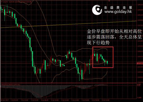今日現貨黃金開盤1226.70美元/盎司,截至北京時間下午5點20分,最高價格為1229.02美元/盎司,最低價格為1222.95美元/盎司。日內來看,金價早盤即開始從相對高位逐步震蕩回落,全天總體呈現下行趨勢。美元指數小幅沖高后回落,技術面中性偏弱,消息面冷清,市場等待今晚的ADP數據。 圖 1 金價日內走勢 消息面今天較為平靜。此前,聯合國安理會就朝鮮最新挑釁行動召開緊急會議,美國代表稱,朝鮮的導彈試射正在迅速關閉外交解決的大門,倘若必要美國將對朝鮮動武。這一表態可能將加劇地緣形勢的緊張。中國和俄羅斯尚未有明顯區別于此前的態度。同時,中國邊界被印度越界一事尚未解決,地緣政治形勢正在逐步惡化,這對金價是潛在的利多。此外今晚將公布的ADP就業數據看,由于前期ISM就業等數據已經走強,因此需要警惕數據走高造成的不利影響。 市場層面看,日本股市受朝鮮緊張局勢拖累收低,建筑類股因災害重建需求而上揚,日經指數跌0.4%至19994.06點。中國股市續創逾兩個半月收盤新高,但獲利回吐壓力加大,上證綜指收報3212.44點,漲5.31點或0.17%。香港股市收跌,此前美聯儲會議記錄顯示,美聯儲內部對未來升息步伐缺乏共識,恒生指數下跌0.2%至25465.22點。匯率方面,美聯儲公布會議記錄后美元反彈遇阻,市場正在關注ADP和非農就業數據。國際能源價格受美國原油庫存下降推動而上漲,布倫特油價反彈超過1%。 技術面上看,昨日金價停止進一步下探上一個低點1214美元附近后,有所企穩并小幅反彈,技術面繼續得到修復,但總體走勢仍較弱,投資者謹慎等待今晚的ADP和明日非農數據。短期來看,下一強支撐位位于1200美元整數關口附近,上方1238美元位置則已形成壓力。中期來看,1260美元附近的壓力也需要予以警惕,上方重要壓力仍在1295至1300美元附近。 今晚8點15分公布美國6月ADP就業人數變動,10點公布美國6月ISM非制造業指數,上述數據需要予以關注。 投資有風險,入市需謹慎。以上建議僅供參考,不作為唯一投資依據。