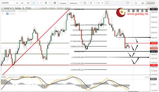現貨黃金周四(7月6日)亞市早盤開于1226.45美元/盎司,最低下探1222.06美元/盎司,最高上漲至1229.07美元/盎司,收于1224.90美元/盎司,下跌1.66美元,跌幅0.14%。 昨日晚間素有小非農之稱的ADP就業報告顯示,美國6月ADP就業人數僅增加15.8萬,較上個月的數據顯著下滑,且不及市場的預期。數據顯示,美國6月ADP就業人數增加15.8萬人,預期增加18.3萬人,前值修正為增加23.0萬人,初值增加25.3萬人。美國PMI服務業指數強于預期為54.2,表明美國服務行業有穩健增長。這些數據的發布對美元和黃金的走勢影響不明顯。 美國勞工部昨日公布的數據顯示,美國上周初請失業金人數連續三周錄得上升,不過仍然低于30萬。數據顯示,美國7月1日當周初請失業金人數增加0.4萬至24.8萬,預期24.3萬。已經連續122周低于30萬關口,連續時間創1970年以來最長。路透點評稱,上周美國初請失業金人數小幅上漲,為連續三周上漲,可能是由于汽車制造商因夏季重組而關閉工廠導致。4.3%的失業率說明勞動力市場已接近充分就業。 銀美林分析師在最新的市場報告中表示,他們對黃金仍持建設性態度,即黃金可能在今年年底前達到1,400美元/盎司左右。美銀美林分析師稱,對黃金有利的最大因素是,投資者對市場風險過于自滿。“我們認為,市場過于自滿,投資者應該在波動風險敞口的工具中建立頭寸。從整體上來說,我們相信,有多種選擇可以保護投資組合不受政策風險增加和投資者倉位迅速逆轉的影響。投資者可以選擇增加他們的黃金配置。” RBC財富管理總監喬治·吉羅(George Gero)在昨日發布的報告中稱,隨著投資者繼續消化最新的美聯邦公開市場委員會FOMC會議記錄和美國就業數據,黃金價格繼續上漲。而根據周位資深貴金屬專家的說法,黃金現在將面臨回撤。 “交易者們正在集中精力對付明年可能的三次升息,以及9月份之后資產負債表的縮減,所有這些都使黃金處于防御狀態。 7月7日黃金ETFs數據顯示,截止7月6日黃金ETF-SPDR Gold Trust的黃金持倉量846.29噸,較上一交易日減少6.21噸; Gold Trust 7月7日數據顯示,Gold Trust 7月6日黃金持有量210.35噸,較上一交易日持平。白銀持有量10562.9噸,較上一交易日持平。 黃金技術分析: 現貨黃金周四(7月6日)亞盤和歐盤基本呈現低位震蕩的走勢,美盤總體變化不大,維持盤整態勢。因此關注不變,目前下方就是重點關注1223.50-1214,該區域屬于強勢買盤區域,尤其是前低1214一線,我個人認為是三浪中擴展中的回調浪,如果下破1214,則有可能走出AB等于CD的形態,下方則需關注1203和1192兩線。上方短線可以關注1228-1229.60和1233美元/盎司附近區域。目前日線級別屬于大跌后的盤整階段,不能算企穩,單就日內短線而言,看短線企穩最好上破1230一線。若能突破1230關注1240-1245的阻力區間, 黃金操作建議: 上方阻力:1228-1229.60、1233、1240.70-1242.60