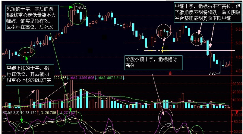 十字:十字有見頂的十字和中繼的十字,要注意區分 解析意義:十字的出現表明原有趨勢已經進入一種不確定的狀態,其后趨勢需要后續K線來確認。
