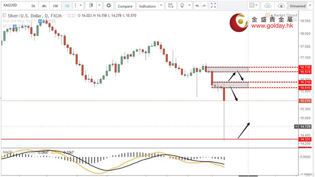 下方支撐:1203、1189 白銀技術分析: 現貨白銀上周五(7月8日)亞盤和歐盤維持低位的橫盤震蕩走勢,美盤受數據影響繼續走低,日線和周線均以大陰收線。下方繼續關注前低,除此之外暫時我看不出什么好的支撐位置,上方關注16.00-16.20和16.57-16.73美元/盎司的支撐,首次反抽這兩個區間可以考慮做空。暫時未出現明顯的企穩形態,因此抄底還是需要謹慎。 白銀操作建議: 上方阻力:16.00-16.20、16.57-16.73 下方支撐:14.33-14.03 今日重要數據: 14:00 德國5月未季調貿易帳(億歐元) 16:30 歐元區7月Sentix投資者信心指數 22:00 加拿大至7月7日全國經濟信心指數 22:00 美國6月就業市場狀況指數(LMCI) 注:入市有風險,投資需謹慎,以上建議僅供參考,不作為投資唯一依據。 金盛貴金屬投資分析部 |