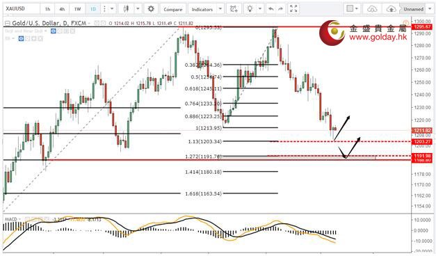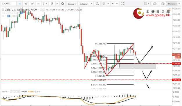 現貨黃金周一(7月10日)亞市早盤開于1212.08美元/盎司,最低下探1204.80美元/盎司,最高上漲至1215.40美元/盎司,收于1213.94美元/盎司,上漲1.14美元,漲幅0.09%。 美聯儲昨日公布,美國6月就業市場狀況指數(LMCI)為1.5,低于前值2.3和預期2.5。LMCI是美聯儲基于19個指標綜合而成的一個模型,其中失業率和非農私企就業人口數據的權重很高,但該模型也同時考慮了其他因素,例如JOLTS職位空缺、兼職人口;可以幫助市場更好理解近期經濟中工資、就業和相關數據的影響。 德國商業銀行在昨日發布的報告中稱,黃金周五從黃金ETF中流出,但白銀ETFS錄得流入。德商稱:“黃金周五的價格下滑,伴隨著ETF流出六噸。 上周的流出量為22.6噸,相當于12月中旬以來最大的每周流出量。相比之下,白銀ETF周五的流入量接近74噸,盡管這不能防止白銀在新的一周開始時下跌至15個月最低點15.20美元/盎司。 Sprott執行長Peter Grosskopf昨日表示,從近期疲弱的經濟數據來看,他并不認為美國經濟如一些官員說的那樣強勁。同時,他對黃金持有看漲的觀點,并認為投資者可將近期金價的下跌視為買入良機。他當天在接受采訪時稱,“我們對黃金有一個良好的長期建設性的觀點,就是你應當不斷積累這一資產。事實上,黃金正是大部分投資者投資不足的領域。”Grosskopf表示,“眼下全球擁有太多的債務,這些問題最終將會爆發,而且也沒人能夠預測到。不過,黃金將起到對這一風險的良好對沖作用。” 7月11日黃金ETFs數據顯示,截止7月10日黃金ETF-SPDR Gold Trust的黃金持倉量832.39噸,較上一交易日減少2.96噸; Gold Trust 7月11日數據顯示,Gold Trust 7月10日黃金持有量211.41噸,較上一交易日增加0.65噸。白銀持有量10720.2噸,較上一交易日增加91.17噸。 黃金技術分析: 現貨黃金周一(7月10日)亞盤和歐盤再度走低,美盤有小幅的反彈企穩。之前我們說下方可以重點關注1203和1189美元/盎司附近,分別是黃金分割1.13和1.27黃金分割的位置,獲得支撐可以考慮做多,昨日的最低點1204接近1203,從目前的形態看,如果要想確認黃金在1204企穩,小時級別這次的回調最好不要下破1209-1207美元/盎司區間。如果下破不排除會有筑雙底或者繼續下探1190美元/盎司的可能性。 黃金操作建議: 上方阻力:1220、1230、1240-1245