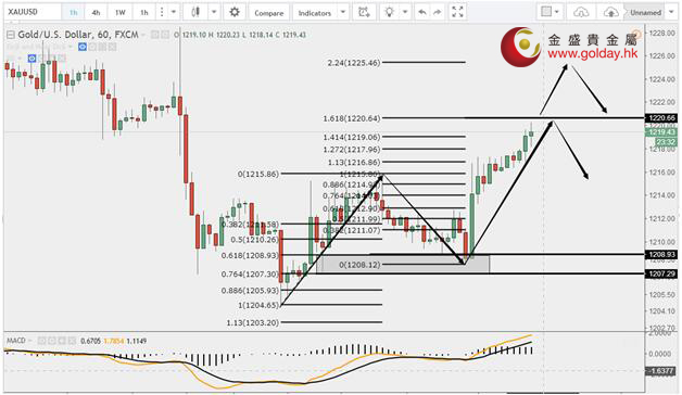 現貨黃金周二(7月11日)亞市早盤開于1213.95美元/盎司,最低下探1208.00美元/盎司,最高上漲至1217.40美元/盎司,收于1217.10美元/盎司,上漲3.16美元,漲幅0.26%。 昨日特朗普長子小唐納德·特朗普公布了一系列電郵,電郵透露了他在美國總統大選期間接觸俄羅斯人士的細節,令特朗普的“通俄門”又現危機,引發了市場避險情緒,美元美股下挫,而黃金等避險資產重獲提振。據《紐約時報》報道,特朗普的大兒子小特朗普公布了與去年會見俄羅斯律師有關的郵件。在一封6月3日的郵件中寫到,一名特朗普曾經的商業伙伴與俄羅斯政府高官有聯系,可以為特朗普的競選團隊提供關于希拉里的“猛料”并表示這是俄羅斯政府對特朗普先生的支持。 美國商業統計局昨日公布,美國5月批發銷售月率下跌0.5%;低于前值-0.4%和預期-0.4%。批發商是制造商和零售商的中間商,是商業領域的緩沖環節。批發銷售領域的趨勢通常能說明其它經濟領域的狀況,經濟學家通常會利用這一數據來對GDP進行預測。 道明證券在昨日發布的報告中稱,預期近期美聯儲主席耶倫(Yeten Yellen)仍將持守鷹派,黃金可能在短期內繼續受壓,但不可能持續下滑。耶倫計劃周三上午向眾議院金融服務委員會作證。道明稱 “事實上,預計耶倫將繼續表現出強硬的態度,并準備進一步規范利率,及開始收縮資產負債表。耶倫在本周的證詞及其他美聯儲委員的鷹派論調對加息會很有利,也有助于美元從低位反彈,提供了一個使黃金將進一步測試3月份的低點1200美元/盎司的環境! 7月11日黃金ETFs數據顯示,截止7月10日黃金ETF-SPDR Gold Trust的黃金持倉量832.39噸,較上一交易日減少2.96噸; Gold Trust 7月11日數據顯示,Gold Trust 7月10日黃金持有量211.41噸,較上一交易日增加0.65噸。白銀持有量10720.2噸,較上一交易日增加91.17噸。 黃金技術分析: 現貨黃金周二(7月11日)亞盤和歐盤再度小幅震蕩走低,完美達到我們昨天做多的區間,美盤受郵件門事件影響大幅走高。之前我們說下方可以重點關注1203和1189美元/盎司附近,分別是黃金分割1.13和1.27黃金分割的位置,獲得支撐可以考慮做多,昨日也說過如果要想確認黃金在1204企穩,小時級別這次的回調最好不要下破1209-1207美元/盎司區間。目前上方重點關注1220.60、1225.50和1230美元/盎司附近。下方暫時關注1208-1220這段黃金分割的0.382、0.5和0.618三線1212-1215區間。因為晚間有耶倫講話,不排除回調會下破0.618一線。 黃金操作建議: 上方阻力:1220、1225、1230、1240-1245
