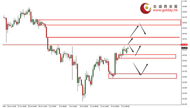 下方支撐:1234-1233、1231-1229、1226.60-1228.60 白銀技術分析: 現貨白銀周一(7月17日)亞盤和歐盤基本維持小幅橫盤震蕩的走勢,美盤震蕩上行,昨日說過考慮到上方阻力已經測試了兩次,因此后面突破的概率大,上方關注16.00-16.20、16.35和16.57-16.73美元/盎司的支撐,首次反抽這兩個區間可以考慮做空,昨晚已經完成了首次觸及。回落下方可以關注16.00整數關口附近的支撐。 白銀操作建議: 上方阻力:16.00-16.20、16.35、16.57-16.73 下方支撐:16.00、15.32-15.16、14.26-13.73 今日重要數據: 20:30