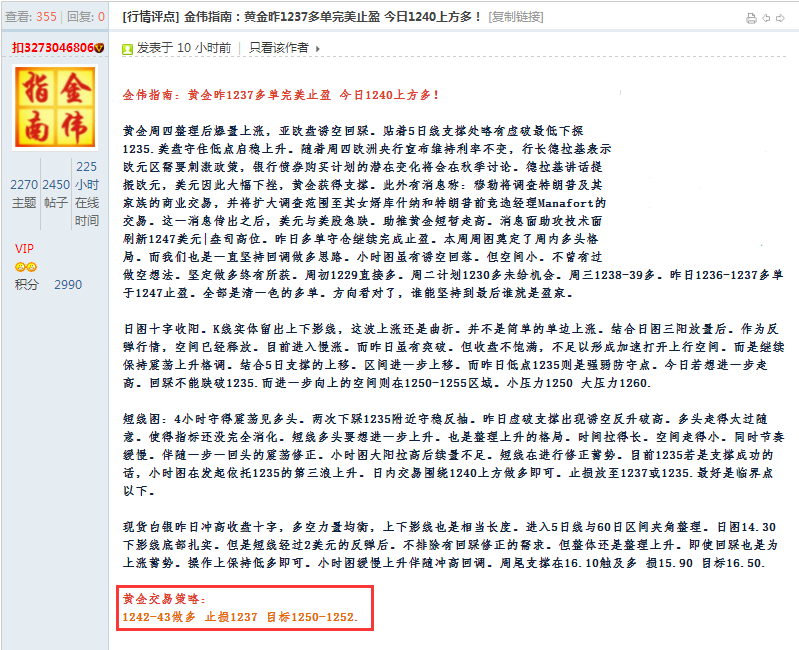 金偉指南:黃金1243多單獲利,原油策略不變! 黃金亞歐盤進一步延續昨日破高多頭,早盤回踩1243一線啟穩開始震蕩上升。截止目前5美元的波幅。相對小了一點。但是歐盤格局強勢不錯。美盤應該還小有延續。暫時先看10美元左右的波幅。日內消息面缺少,單技術面的波動可能就相對小一點。壓力點在1250-1255.差不多是今天的上升幅度。 日圖突破昨日十字K線高點。形態中繼上漲。今日只要收盤陽線。下周繼續上漲。周圖則是雙陽反彈顯強,趨勢奠定了多頭。操作上就要保持做多思路,猶如本周我們一直堅定做多思路一樣。就是看好周圖連陽的大機率事件,連續的震蕩上升過程的做多,都有所收獲,就是看利潤大小的問題,誰能堅持的時間越長。利潤就越大。 今日早盤繼續給出1242-1243做多。最低給到1243進場機會。日評也同步有給出策略。跟進的目前繼續獲利中。幾乎是捉到今日的最低點。昨日1236-37的多單于1247止盈。也同樣鎖定住了昨日的高低點利潤。趨勢不用多說,既然看多,就是找點位多,不要考慮任何的空單。沒什么意義。反倒容易錯過多單進場的點位。看準了多頭方向就找做多點位。手中多單稍后靠近1250附近可先完成止盈。然后待美盤回踩1244-45繼續做多 止損1240即可 目標1252.迂回震蕩上升。回調把握做多,破高及時止盈即可。 原油策略不變,回落46.20做多 止損45.70 目標47.209。 |