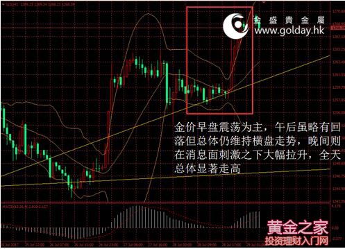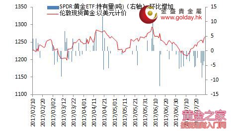上一交易日現貨黃金開盤1259.25美元/盎司,最高1270.76美元/盎司,最低1257.24美元/盎司,收盤1270.59美元/盎司,收盤下跌11.77美元,跌幅0.94%。日內來看,金價早盤震蕩為主,午后雖略有回落但總體仍維持橫盤走勢,晚間則在消息面刺激之下大幅拉升,全天總體顯著走高。消息面偏多,美元指數進一步回落再次刷新低位,主要現貨投資者倉位不變,技術面偏多。 圖1黃金價格走勢 消息面上看,美國第二季度經濟增長率反彈至2.6%,略微超出預期。具體來看,庫存對GDP的拖累明顯下降,消費的貢獻略有上升,固定資產投資的拉動作用則有所減弱。此外GDP平減指數超預期走弱,結合近期公布的其他數據總體來看,美國經濟增長正在走出此前的放慢而出現加速的跡象,但通脹回升的速度仍不快。這也是上周五金價大幅拉升的主要原因之一。 美聯儲方面,明尼阿波利斯聯儲行長Kashkari稱,幾乎沒有通脹回升的跡象,在任何利率行動之前先等待更多的數據,該講話符合其一貫的鴿派態度,市場對此反應有限。 此外,朝鮮上周五晚進行本月第二次試射洲際彈道導彈。隨后美國國防部表示,美韓軍方高層探討了針對朝鮮的軍事選項,美國總統特朗普就朝鮮問題對中國表示失望。中國則稱反對朝鮮違背安理會決議試射導彈,敦促韓美雙方停止有關“薩德”部署進程。同時,韓聯社援引未具名政府人士報道稱,聯合國安理會本周初可能就朝鮮發射導彈召開緊急會議。目前對該事件各方反應有限,我們將持續關注可能對朝鮮的制裁行動,以及其他潛在的對抗升級的可能,這對金價而言是潛在的利多。