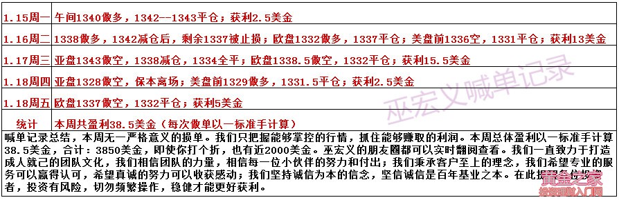 做對(duì)一單二單很容易,出現(xiàn)錯(cuò)誤也很正常,沒(méi)有百分百的老師。但是能夠持續(xù)連贏,首先需要對(duì)行情的節(jié)奏梳理和定位非常清楚,其次就是良好的心態(tài)和情緒管理,不急不躁,比如本周的洗盤行情過(guò)于著急入市往往被動(dòng)。而我們近期能夠持續(xù)連贏不外乎這兩個(gè)原因,節(jié)奏把握準(zhǔn)確,心態(tài)和情緒好,不急不燥。 從4小時(shí)圖來(lái)看,近期的走勢(shì)就足以看出復(fù)雜和反復(fù)。1236的快速做底反轉(zhuǎn),碎陽(yáng)慢漲到1326之后,陷入了兩周的陰陽(yáng)交替洗盤整理。多頭趨勢(shì)停頓,高位反復(fù)。上上周四突破,周五急跌探底回升中陽(yáng)收盤,但是本周依然未能延續(xù)這個(gè)強(qiáng)勢(shì),而是持續(xù)的高位反復(fù)整理,洗盤加劇,規(guī)律性更差。 我們對(duì)本周行情進(jìn)行一個(gè)簡(jiǎn)單的回顧: 黃金整體1345和1324的21美金高位反復(fù)整理,周一周二沖高回落探底回升紡錘K線,周三過(guò)山車放量中陰,周四十字星,周五企穩(wěn)亞歐盤震蕩反彈,美盤小整理收陽(yáng),周線五連陽(yáng)之后紡錘陰。一個(gè)洗盤緊跟一個(gè)洗盤。 對(duì)于行情的把控我們本周操作非常不錯(cuò): 周一:午間1340做多,1342--1343平倉(cāng)。 周二:1338做多,1342減倉(cāng)后,剩余1337被止損;歐盤1332做多,1337平倉(cāng);美盤前1336空,1331平倉(cāng)。 周三:亞盤1343做空,1338減倉(cāng),1334全平;歐盤1338.5做空,1332平倉(cāng)。 周四:亞盤1328做空,保本離場(chǎng);美盤前1329做多,1331.5平倉(cāng)。 周五:歐盤1337做空,1332平倉(cāng)。 整體來(lái)說(shuō)獲利38.5美金,平均每個(gè)交易日獲利7美金多,且無(wú)一嚴(yán)格意義上的損單,朋友圈都實(shí)時(shí)更新。我們有思路,有解讀,每周周評(píng)定主節(jié)奏和歸類行情,制定操作手法,每天根據(jù)盤面變化調(diào)整和制定具體操作策略,每天文章讓大家明白我們的思路,知道我們的下單依據(jù)。 展望下周,我們從消息面和技術(shù)面分別來(lái)做解讀: 消息面上:下周大事日程緊鑼密鼓,日本央行和歐洲央行分別將于下周二和周四公布貨幣政策決定。外界預(yù)計(jì)日本央行料維持政策不變。而歐洲央行不大可能放棄繼續(xù)購(gòu)債的承諾,因決策者需要更多時(shí)間來(lái)評(píng)估經(jīng)濟(jì)和歐元的前景。日本央行和歐洲央行的政策決定,有望進(jìn)一步打壓美元,提振黃金。 技術(shù)面上:周線五連陽(yáng),這輪多頭走勢(shì)極強(qiáng),不管陰陽(yáng)交替的橫盤整理,還是本周的反復(fù)都是多頭趨勢(shì)的停頓和價(jià)格修復(fù),后市繼續(xù)看漲。尤其本周的周線小陰,五連陽(yáng)之后跟隨小陰線,典型多頭趨勢(shì)修正行情。日線級(jí)別來(lái)看,1345短周期的小雙頂,且日線高位黃昏之星K線組合,周五反彈二次沖高不破新高后回落,短期內(nèi)有回落的需求。 同時(shí)周末的時(shí)候,各種消息頻發(fā),首先是美國(guó)政府停擺,特朗普成為美國(guó)歷史上任職期間內(nèi)最快美國(guó)政府關(guān)門的總統(tǒng);其次是土耳其對(duì)敘利亞西北部地區(qū)發(fā)動(dòng)了地面攻擊;再次是德國(guó)社民黨將在周日召開黨代會(huì)進(jìn)行投票,表決是否與德國(guó)總理默克爾領(lǐng)導(dǎo)的聯(lián)盟黨開始正式組閣談判。若其批準(zhǔn)談判,意味著德國(guó)更加接近建立一個(gè)穩(wěn)定的政府。三則消息都利多黃金,是否會(huì)引發(fā)下周一黃金跳空高開呢? 綜上所述,下周一黃金是否跳空高開,我們不去做猜測(cè),耐心等待開盤后一切自知。而對(duì)于黃金的下周走勢(shì),巫宏義看漲,至于是直接上漲還是回調(diào)后上漲,還需等待周一收盤后再來(lái)做更準(zhǔn)確的判斷。上方阻力關(guān)注1338、1345;下方支撐關(guān)注1324、1315、1308。 以上出自分析師巫宏義,更多做單策略及中長(zhǎng)線布局可聯(lián)系筆者,盤中及時(shí)通知為主。 |