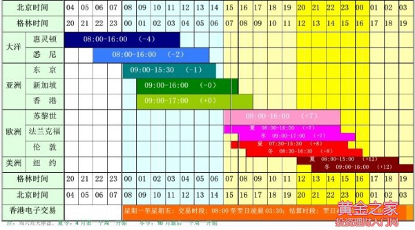 倫敦金交易時(shí)間(全球交易/開盤時(shí)間表) 因起源于倫敦而得名倫敦金,每個(gè)地區(qū)都有倫敦金交易所,因地區(qū)不同所以開盤時(shí)間會(huì)有所不同。 主要如下: 悉尼倫敦金交易時(shí)間:06:00---15:00 東京倫敦金交易時(shí)間:08:00---15:30 香港倫敦金交易時(shí)間:09:00---16:00 法蘭克福倫敦金交易時(shí)間:15:00---23:00 倫敦金交易時(shí)間:15:30---23:30(冬令時(shí)間16:30---00:30) 紐約倫敦金交易時(shí)間:20:20---03:00(冬令時(shí)間21:20---04:00)。 倫敦金哪個(gè)時(shí)間段交易好 亞盤:早上7:00-15:30(冬令時(shí)16:30),行情比較清淡,觀望為主。可進(jìn)行小手筆交易。 歐盤:15:30(16:30)-20:30(冬令時(shí)21:30),行情開始活躍,可抓住機(jī)會(huì)適當(dāng)做單 美盤:20:30(21:30)-早上7:00,美盤時(shí)段行情伴隨消息面和資金大量涌入市場(chǎng),開始變得活躍,適合投資把握行情賺大行情。 每周六日休市時(shí)間(雙休) 在夏令時(shí)間,即每年的4月-10月,倫敦金的交易時(shí)間為北京時(shí)間每周一07:05至周六的03:00,因此休市時(shí)間為周六03:00至周一07:05開市前,共約52小時(shí)。 在冬令時(shí)間,即每年的11月-3月,倫敦金的交易時(shí)間為北京時(shí)間的周一07:05至周六04:00,因此休市時(shí)間為周六04:00至周一07:05開市前,共約51小時(shí)。 每天休市時(shí)間 在夏令時(shí)間:周二至周五05:00至06:05為系統(tǒng)維護(hù)及結(jié)算時(shí)間,暫停進(jìn)行交易 在冬令時(shí)間:周二至周五06:00至07:05為系統(tǒng)維護(hù)及結(jié)算時(shí)間,暫停進(jìn)行交易 |