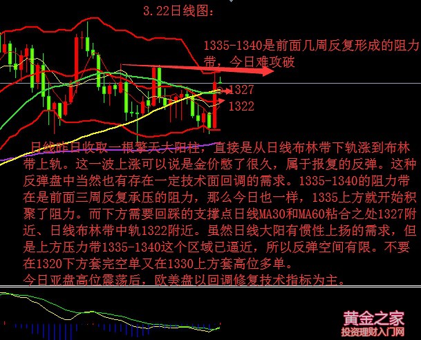 金銀同道:夢斷加息時,活在黃金里。 前言概述: 美聯儲宣布加息,按照預期加息了25個百分點,但市場注意到美聯儲對今年加息三次的預計維持不變,使得此前對四次加息的期望落空。受此影響,美元遭到投資者拋售,金價一路高歌。隔日金價開盤后是直接成一個慢漲走勢,凌晨兩點消息面出來后直接助攻金價拉升到最高1336美元/盎司,最終收盤報收1331,當前開盤金價處于1330上方整理。 技術面: 這幾天堅定從1310下方看多上來的思路驗證了方向是對的,希望給部分采納者給予了一定的幫助。經歷昨日一波走勢后,金價脫離了前幾個交易日在1320下方做弱勢震蕩的走勢,F很明顯把金價波幅的區間上移到了1320-1340.對于1310-1300這個敏感地區前面三個交易日在分析中反復的提到過,看空但不宜過分追求下方空間,敏感地帶是適合拿多單上來,把1310-1300回踩的這個區間當做是鞏固下方支撐。美聯儲利率決議是金價很好上破1320的一個契機,昨日分析中綜合對金價和美指一起做了分析。美聯儲加息基本是鐵板上釘釘的事,市場早已消化差不多,加上美指月線圖很難一根K線實現逆轉,釜底抽薪,前期下跌過程中在90上方承受的壓力不小。日線昨日收取一根擎天大陽柱,直接是從日線布林帶下軌漲到布林帶上軌。這一波上漲可以說是金價憋了很久,屬于報復的反彈。這種反彈盤中當然也有存在一定技術面回調的需求。1340的阻力帶在是前面三周反復承壓的阻力,那么今日也一樣,1335上方就開始積聚了阻力。而下方需要回踩的支撐點日線MA30和MA60粘合之處1327附近、日線布林帶中軌1322附近。雖然日線大陽有慣性上揚的需求,但是上方壓力帶1335-1340這個區域已逼近,所以反彈空間有限。不要在1320下方套完空單又在1330上方套高位多單。今日亞盤高位震蕩后,歐美盤以回調修復技術指標為主。 綜上所述: 日線大陽有慣性上揚的需求,但已逼近1335-1340這個阻力帶,所以反彈空間有限,不要高位追多。今日預計亞盤高位震蕩后,歐盤走回調為主,今日區間1340-1320,下方回踩點1327/1322。 日內布局建議: 1#:1335附近逢高加倉空,止損1340上,利潤1323-1322(中間1327可以作為減倉點位)。 2#1323-1322全天掛多單,止損1319,利潤1327-1330. 今日數據提示 黃金方面除常規數據外,無其他風險事件 文/金銀同道 |