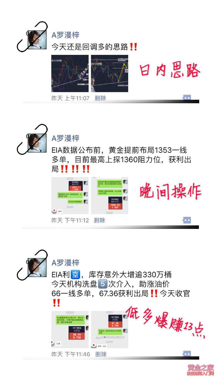 你是不是還在等回調,是不是以為每次上漲都以為是做空的機會,周一的1326追空、周二1330追空、漫梓相信昨天肯定有朋友在1340及上方追空的朋友,結果總是事與愿違,空單進場的朋友要么掃損要么被套。昨日早間出于穩健漫梓給的是1336的多單,但是亞盤行情根本就沒給到回調直接上漲,可能有些朋友守住點位沒能進場,亞市尾盤漫梓直接通知實盤1342一線多進,避免踏空失去進場機會,行情上探1350通知獲利了結; 昨日EIA數據如同漫梓預期利空,但是黃金原油的多頭走勢完全不受任何影響,小幅回調(空間并不大)后再次暴漲;按照昨天的行情,數據只能作為參考,實質性的操作還以多頭的技術面為主。EIA數據公布后漫梓通知黃金原油現價多單進場,漫梓知道行情還有上漲空間,黃金當時現價是1353,原油當時是66位置,多單不抓利潤那還干啥?昨天機構洗盤五次進場,助漲多單收割,黃金漲至1360獲利7美元出局,原油67.4獲利14美元出局; 4.12黃金走勢分析: 昨日繼續走高,金價突破1360關口,高點觸及1365一線,行情整體表現一定的強勢格局。日線圖成功破位盤整了三個月的盤整帶,多頭強勢開啟,漫梓認為后市會繼續強勢上行,我們堅持多單思路,昨日試探1365后承壓回落,后半夜回落至1348位置后收盤在1350一帶,上方阻力能否進一步突破還有待觀察。4小時線單邊上漲,均線多頭排列,附圖指標MACD快慢線金叉運行,短期關注1358-1360阻力,下方關注1350一線支撐,今日重點關注凌晨2點美聯儲紀要會議。漫梓預計日內會是先震蕩修復指標,修復完成后繼續走強的概率大,操作上堅持低多思路不變; 黃金日內操作策略:激進1350多單,穩健1348多單,止損統一4個點,目標點位看至1356-1360; 手上有套單的投資者可與漫梓交流,我需了解你的實際套單情況比如進場點位及風險率等細致因素后給出解套方案。 4.12原油走勢分析 北京時間周三22:30,美國能源信息署(EIA)公布的數據顯示,美國至4月6日當周EIA原油庫存增加逾330萬桶,與此同時,汽油與庫欣地區原油庫存同步錄得增加,美國國內原油產量連續7周錄得增長。數據公布后,美油布油短線縮窄后大幅上漲,WTI原油漲破67美元/桶,因中東緊張局勢可能再度升級。 日線圖來看,油價基本有效突破了BOLL中軌阻力,也初步突破了66.55前期高點,附圖指標MACD和KDJ金叉運行,漫梓根據波浪形態和回檔位分析,原油短線有望進一步上探67.5附近阻力位;4小時級別,單邊上漲,BOLL開口,附圖指標MACD金叉運行后上穿0軸,油價延BOLL上軌向上運行并突破了前期66.55阻力關口,目前阻力轉化為支撐位,有望重新試探新高。上方關注67.5附近阻力,下方關注66.5-66.3附近支撐。 原油日內操作策略:下方66.5一線多單,止損0.4個點,目標點位看至67.2-67.5 撰稿人/羅漫梓 撰稿時間/2018年4月12日 |