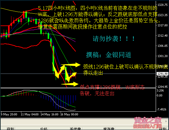 金銀同道:5.17黃金,美指重回93,金價弱勢空頭為主 前言概述: 前一個交易日跌破千三關口后,昨日黃金延續弱勢走關心下跌,最低刷新低點至1286這一線,再次創新了自去年12月份以來的新低。連續兩個交易日的下跌,黃金跌幅已達到28美金。美國國債收益率穩定收高等因素持續推動美指強勢發展,美指企穩在93關口上方,黃金將會在很長一段時間內保持空頭壓制的走勢。 技術面: 本周本周最高從1322一路下跌至昨日的低點1286,當前K線是一根實體大陰,這就奠定了本周周線收陰已毫無懸念,大周期在本周就是繼續以空頭為主,在行情還沒企穩止跌前,下方繼續關注大周期兩個支撐帶1280和1260。世界銀行的觀點分析今年年中黃金價格再次回到千三下方,那就預測2018年內金價即時后市破位歷史阻力帶1265這一線,放大的空間也不會太大,總體還是以大震蕩為主。故筆者再次提醒市場中有做TD黃金和紙黃金的朋友,不是單邊大牛市200個以上,不適宜操作。因為黃金TD和紙黃金以人民幣元/克報價,報價單位小,國際金走一波波段它們才剛剛保本,再者加上占用保證金比例較高。 日線昨日收取了一根陰十字星,十字星高點在1296,十字星低點在1286。十字星收線的預示判斷有3種:1,要么行情繼續在十字星高低點之間來回做震蕩;2,破位上高高點壓力1296,則金價短期轉強,下行空間勢能減弱;3,跌破低點支撐1286,還會繼續帶來慣性下跌,當日內1290即轉為強阻力。 四小時經歷了連續兩個交易日下跌都刷新了低點,每刷新一次低點都帶來了小幅反彈。當前四小時K線有跡象在走一個不規則的W底形態,當然此形態得上破頸線阻力1296方能得以形成;反之跌破底部低點支撐1286,空頭勢能會進一步繼續放大,走慣性下跌。四小時K線圖如下圖 小時線自昨晚美盤尾盤后一直是個盤整形態,盤整區間在1295-1287。此震蕩區間預計會圍繞整個亞盤走勢,亞盤可在此區間反彈高位做空下去。 日內策略: ①:上午亞盤金價見1295附近做空,止損1298上,目標回看1290-1288。 ②:若金價強勢上行試探1297,回落1292附近做多,止損1288下,利潤再次上看1297-1300附近離場。1302附近做空,止損1305上,目標回看1295-1293。 ③:近日某個時段再次刷新低破位1286則繼續空,屆時金價1290都難上 【今日重點關注的財經數據與事件】2018年5月17日 周四 ① 20:30 美國至5月12日當周初請失業金人數、美國5月費城聯儲制造業指數 ② 22:00 美國4月諮商會領先指標月率 ③ 22:30 美國至5月11日當周EIA天然氣庫存 天下熙熙皆為利來,天下攘攘皆為利往。 文/金銀同道 |