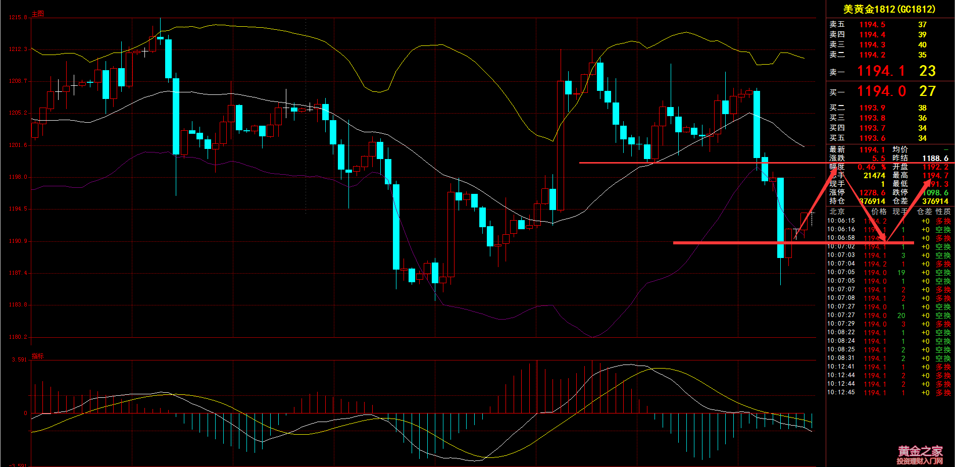 黃金方面:從目前的走勢來看,黃金依舊處于弱勢運行,美元非農后表現依舊強勢,對黃金依舊形成*,在此情況下,黃金在在美元高位持穩的情況下,再次跌破1200、1190雙重關口。黃金短期目前承壓于1200,市場對本周美國經濟數據的預期比較樂觀,美元繼續震蕩上攻。 黃金4小時圖來看,K線已經跌穿了布林帶下軌支撐,MACD死叉向下,綠色能量柱放量,短線偏向于空頭方向,初步支撐在1190附近,進一步支撐在1186附近,也是9月28日的低點。KDJ死叉向下發散,不過目前已經出現超賣區域,謹防低位反彈,上方初步阻力在布林帶下軌1196附近,如果能夠收復該位置阻力,則有望上探1198附近阻力,也是昨天的美盤時段暴跌的起跌點。日內操作上建議高空低多區間操作為主,上方關注1200附近阻力,下方關注1190附近支撐。 【原油行情分析】