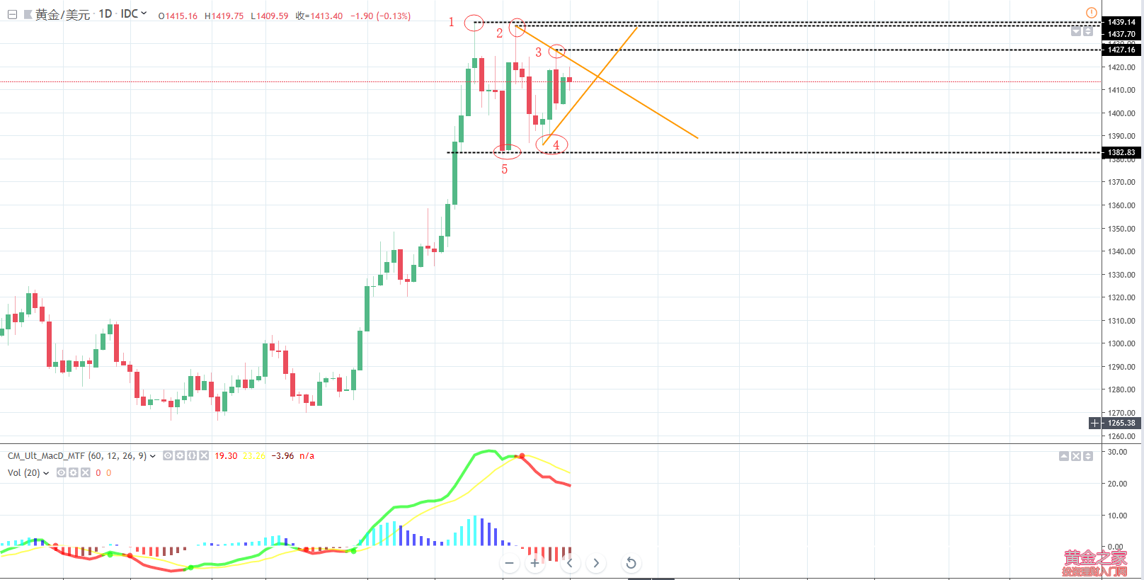 交易,就像一場(chǎng)新雪,每一步都會(huì)落下清晰的腳印。你無(wú)法決定今天是漲是跌,無(wú)法決定入場(chǎng)后的堅(jiān)持能換來(lái)什么具體結(jié)果,但你能決定的是,控制每一筆交易的風(fēng)險(xiǎn) 黃金技術(shù)分析: 黃金周線5日均線是五月開啟單邊上漲的均線支撐線,經(jīng)過三周的橫盤調(diào)整,均線繼續(xù)向上靠攏,均線與上軌形成區(qū)間1406-1426成為本周重點(diǎn)關(guān)注區(qū)域。 日線布林帶收口區(qū)間1400-1440,以生命線作為分界,生命線之上震蕩偏多,生命線之下震蕩偏空,高位箱體區(qū)間調(diào)整,生命線仍是堅(jiān)守有效,周內(nèi)關(guān)注生命線得失,想要打開前期的1440-1410-1380的箱體區(qū)間,必須破位形成強(qiáng)勁突破,否則仍將會(huì)是區(qū)間來(lái)回切換。5日10日均線支撐粘合1409,生命線支撐1403,上軌壓力1441。 四小時(shí)上周五依托生命線攀升走高,目前生命線仍是支撐有效,支撐位置1409,雙線均線上軌1406與生命線1409靠攏,下軌1388與布林帶下軌1392靠攏,均線持平走橫,行情仍是區(qū)間震蕩。小時(shí)圖布林帶區(qū)間范圍1418-1404。 早盤直接延續(xù)走高至1420附近,早盤急漲看延續(xù)性和低點(diǎn)防守,亞盤時(shí)間沖高回落跌至1409.5,已經(jīng)將開盤低點(diǎn)跌破,也就意味著日內(nèi)行情繼續(xù)走區(qū)間震蕩。按照震蕩行情的操作思路,支撐做多,阻力做空,鎖定區(qū)間高空低多。 四小時(shí)與日線粘合第一道支撐1409,其次便是多重支撐疊加的1406-1403,壓力關(guān)注日內(nèi)高點(diǎn)的1418-1420,其次上軌壓力1426-1428。 在震蕩行情中,最忌諱的就是順勢(shì)追單,不延續(xù)是震蕩的最大特色,漲了再去做多來(lái)不及,跌了再去做空來(lái)不及,選定好支撐阻力,到位執(zhí)行高空低多。 現(xiàn)在支撐已到位,便是多單進(jìn)場(chǎng),上探阻力收獲,亞盤布局跟進(jìn)1410多單計(jì)劃,鎖定區(qū)間來(lái)回震蕩操作。 黃金操作策略: 亞盤黃金1410多單已經(jīng)進(jìn)場(chǎng)持有,止損1405,目標(biāo)1416-1419 溫馨提示:投資,有錯(cuò)并不怕,怕的是明知道錯(cuò)還將錯(cuò)蔓延!用第一天入場(chǎng)的激情,用最後一天交易的認(rèn)真來(lái)對(duì)待每一次、每一波行情的漲跌。我是劉辰鑫,若您有需要我便伸出援手!(投資有風(fēng)險(xiǎn),入市需謹(jǐn)慎,建議僅供參考) 劉辰鑫老師全方位免費(fèi)指導(dǎo): 工作時(shí)間:早6:00┄次日淩晨2:00(周末也從不停歇,可供隨時(shí)咨詢) 全方位指導(dǎo)老師:劉辰鑫分析團(tuán)隊(duì) 文/劉辰鑫 |