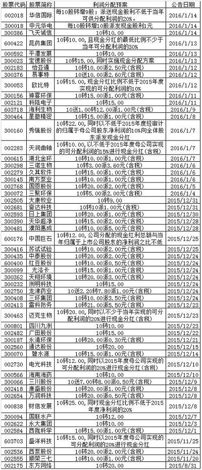 證券時(shí)報(bào)網(wǎng) 01月14日訊 年報(bào)行情是投資者每年必須關(guān)注的熱點(diǎn)。自1月16日開始,2015年上市公司年報(bào)將拉開序幕。截至目前,滬深兩市已有1198家上市公司發(fā)布2015年年報(bào)業(yè)績(jī)預(yù)告。其中,凈利潤(rùn)預(yù)計(jì)增幅在100%以上的公司達(dá)到204家;預(yù)計(jì)扭虧的公司有82家。 飛天誠信38.3610.01% 華信國際---- 在一年一度的年報(bào)行情中,“高送轉(zhuǎn)”題材成為各路資金炒作的“先鋒軍”。從二級(jí)市場(chǎng)的表現(xiàn)來看,不少公司的股價(jià)在推出高送轉(zhuǎn)預(yù)案后出現(xiàn)大漲。如高送轉(zhuǎn)預(yù)案公布后,西泵股份(002536,股吧)股價(jià)連續(xù)3天漲停,盛洋科技(603703,股吧)連續(xù)4天漲停,財(cái)信發(fā)展更是在8個(gè)交易日內(nèi)出現(xiàn)7個(gè)漲停板。 隨著高送轉(zhuǎn)概念的爆炒,越來越多的公司加入到高送轉(zhuǎn)的行列: 1月14日晚間,飛天誠信(300386,股吧)(300386)公告,控股股東、實(shí)際控制人、董事長(zhǎng)黃煜提議公司2015年度的利潤(rùn)分配方案為:以2015年度實(shí)現(xiàn)的可供分配利潤(rùn)的30%向股東分配現(xiàn)金股利;同時(shí),以資本公積向全體股東每10股轉(zhuǎn)增10股。 當(dāng)晚,中元華電(300018,股吧)(300018)也發(fā)布公告,公司8位實(shí)際控制人提議公司2015年度利潤(rùn)分配預(yù)案為:向全體股東每10股派發(fā)現(xiàn)金股利1元,同時(shí)以資本公積金向全體股東每10股轉(zhuǎn)增10股。 華信國際(002018,股吧)(002018)也于當(dāng)晚發(fā)布公告,公司控股股東上海華信提議公司2015年年度利潤(rùn)分配方案:向全體股東每10股轉(zhuǎn)增9股;向全體股東派送現(xiàn)金股利,派送金額(含稅)不低于當(dāng)年可供分配利潤(rùn)的20%。 截至1月14日晚間,滬深兩市已有55家上市公司披露2015年年度分紅預(yù)案,其中,51家公司發(fā)布了10股送轉(zhuǎn)10股及以上的分紅預(yù)案。其中,財(cái)信發(fā)展擬向全體股東每10股轉(zhuǎn)增25股,為上述公司中送股比例最高。此外,日上集團(tuán)(002593,股吧)、秀強(qiáng)股份(300160,股吧)、國恩股份(002768,股吧)、東方網(wǎng)絡(luò)(002175,股吧)、通達(dá)股份(002560,股吧)等公司也均擬在2015年度實(shí)施每10股送轉(zhuǎn)20股或以上。 國信證券(002736,股吧)近期發(fā)布的研究報(bào)告指出,“高送轉(zhuǎn)”是A股歷年炒作主題,歷史數(shù)據(jù)看,預(yù)案披露日前后30個(gè)交易日內(nèi)往往有超額收益。雖然從理論上,“高送轉(zhuǎn)”本身對(duì)公司經(jīng)營(yíng)并無明顯實(shí)質(zhì)影響,但“高送轉(zhuǎn)”事件歷年均受到投資者的高度青睞。從近三年實(shí)施“高送轉(zhuǎn)”的公司股價(jià)表現(xiàn)看,在預(yù)案公告日前30個(gè)、前20個(gè)以及前10個(gè)交易日內(nèi)相對(duì)大盤累計(jì)漲幅達(dá)到9.5%、6.1%和4.4%;在預(yù)案公告日后10個(gè)、后20個(gè)以及后30個(gè)交易日相對(duì)大盤累計(jì)漲幅達(dá)到2.6%、7.5%和14.1%。 今年不同之處在于持股1年以上免收紅利所得稅,對(duì)大股東有利可能促使更多“高送轉(zhuǎn)”發(fā)生。今年上半年股市異常波動(dòng)后,財(cái)政部修改了股息紅利所得稅,規(guī)定持股1年以上的暫免征收所得稅。因此對(duì)大股東來說分紅對(duì)其為有利,因?yàn)榧t股沒有解禁期,同時(shí)可以獲得大額免稅的分紅。今年中報(bào)“10送10”比例高于過去3年,預(yù)計(jì)在新規(guī)下,今年年報(bào)也將會(huì)有更多“高送轉(zhuǎn)”發(fā)生。 以下為已披露2015年年度分紅預(yù)案的公司名單: |