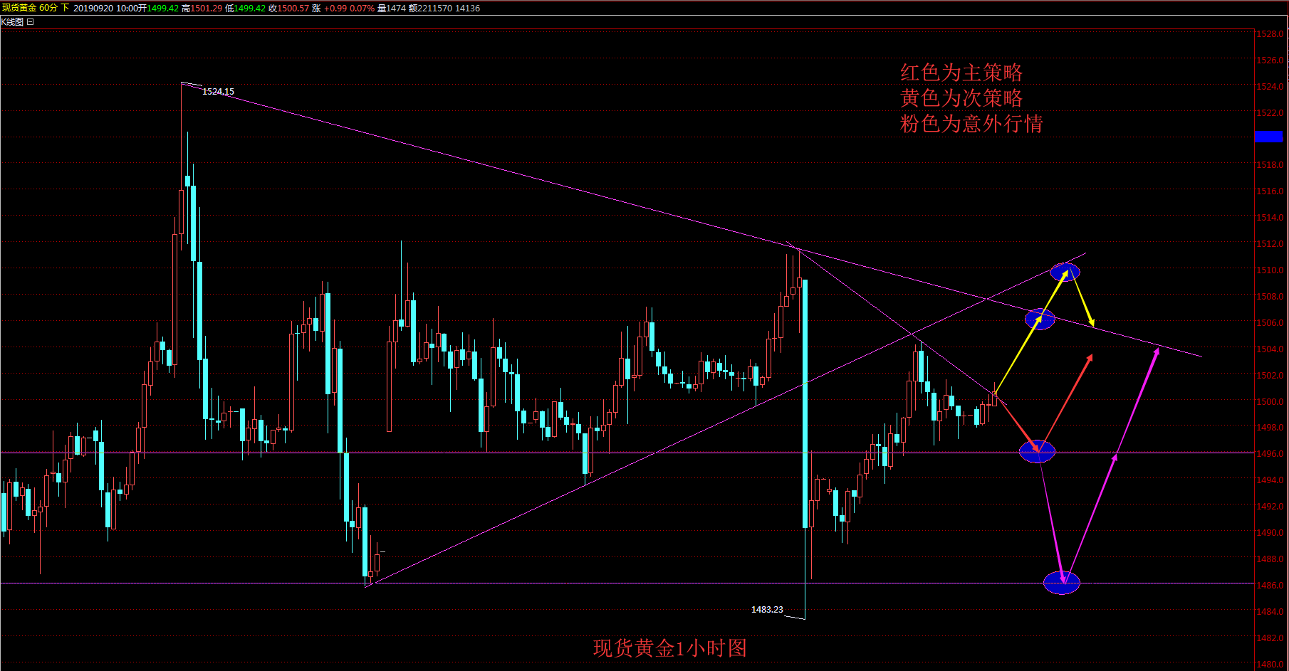 昨日行情回顧:昨日黃金再1494附近開盤后小幅走跌到1488.90附近,隨后一路慢漲震蕩上行,亞歐盤時段在1498附近多次下探后企穩繼續上行,最高到達上方1504.40.隨后承壓下行開始走跌,下方最低觸及1496.45,隨后陷入震蕩與1498.8附近以小陽線收尾。 現貨黃金日內行情分析: 日線級別來說目前在9月5日延續跌破1500關口后已經連續7個交易日在1480-1520來回震蕩,當然最多的還是1480-1510這30美金區間內,反復震蕩依托1480強支撐以時間消耗空頭能量完成筑底,目前5/10日均線在連續多日震蕩時候金叉形成,而金價也站上了5日均線,10日均線在1496附近,目前還不能確定是否在金叉之上企穩,日內多空分界線就是1496這個位置。MACD綠色能量柱縮減,快慢線仍然保持在0軸上方,KDJ指標三線在超賣區域20附近形成金叉,金價有進一步上行的趨勢。 4小時上看昨日晚間收吊頸線之后,金價未能實現快速下破,不過在二連陰之后,金價已經跌到布林帶中軌下方,目前這個位置是5/10 日均線粘合的位置,MACD快慢線還在0軸之下走平,一眾的均線也都在1498附近粘合,這種情況意味著盤整之后,金價必然會找個方向進行突破。 1小時上看目前金價稍微受制于1511.4-1504.4趨勢線第三點1500,但是均線系統在此處粘合,KDJ三線金叉形成但是未能發散,MACD快慢線有死叉跡象,紅色能量柱縮減靠近0軸,目前的行情波動不大,先保持觀望態度。 上方壓力位:1508各趨勢線壓制都在這個位置,同時也是4小時布林帶上軌,在往上的壓力在1515附近,下方支撐1496-1486,下方跌破1496則短期轉入空頭跌向1486附近。