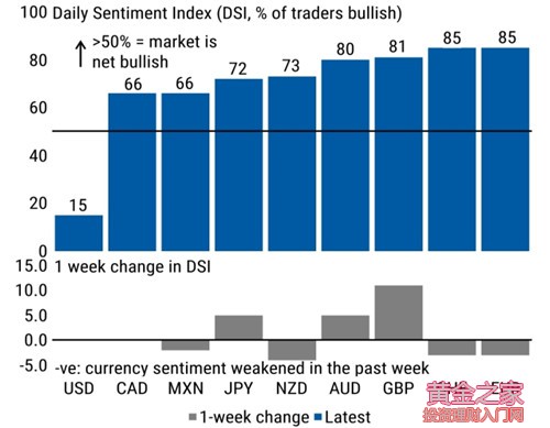 (3) GBP倉位降至小規(guī)模空倉。得益于USD看跌情緒的升溫和GBP兌USD空頭回補現(xiàn)象的影響,GBP的情緒指標迅速改善,從幾乎最被交易員看空(僅稍好于USD)的貨幣,成為最近兩周最被看漲的貨幣之一。但需注意,GBP空倉回補推動的漲勢可能正接近其終點 附圖:G10貨幣情緒指標 來源:trade-futures.com