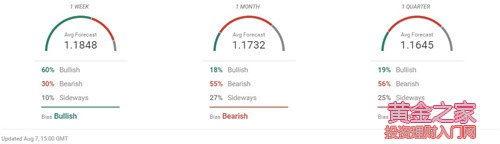 FXsteeet.com: (1)歐元兌美元EUR/USD一周預期中值為1.1848;一個月預期中值為1.1732;三個月預期中值為1.1645 (2)綜合市場觀點,受訪者預測歐元兌美元EUR/USD在未來一周走強,一個月至三個月內(nèi)持續(xù)回落至1.165位置