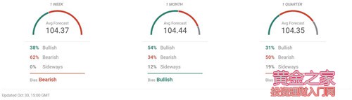 FXsteeet.com: (1)美元兌日元USD/JPY一周預期中值為104.37;一個月預期中值為104.44;三個月預期中值為104.35 (2)綜合市場觀點,受訪者預測美元兌日元USD/JPY未來三個月持續窄幅震蕩