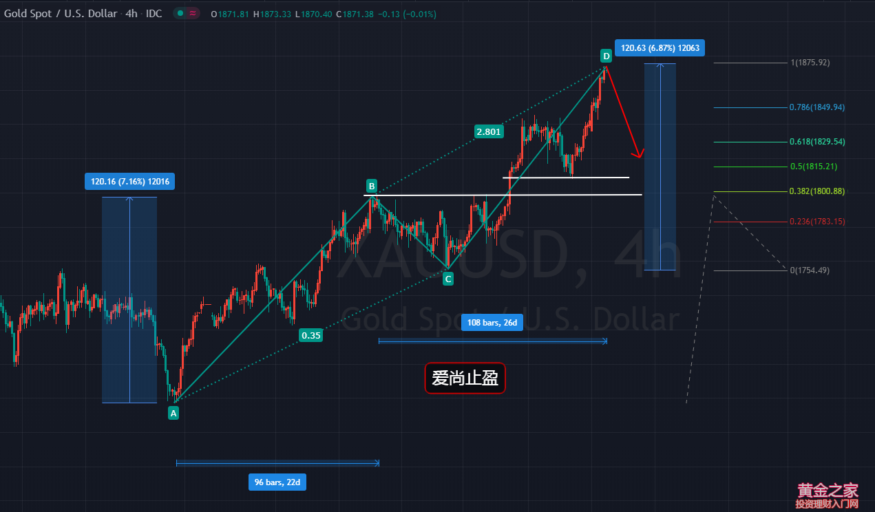 基本面: 周二(5月18日)亞洲時(shí)段,現(xiàn)貨黃金小幅上漲,創(chuàng)1月29日以來新高,目前交投于1872附近。周一(5月17日)金價(jià)大漲1.27%,受到美元疲軟與美國股市走低的推動,另外,克拉里達(dá)的講話進(jìn)一步支撐了金價(jià),巴以沖突和南亞疫情的擴(kuò)散也提升了市場避險(xiǎn)的需求。隨著疫情中心移向亞洲,歐美疫情逐步降溫,這可能進(jìn)一步提振歐美各國的經(jīng)濟(jì)增長。日內(nèi)重點(diǎn)關(guān)注美國房地產(chǎn)數(shù)據(jù),另外留意歐元區(qū)一季度GDP、英國4月失業(yè)率等數(shù)據(jù)。 技術(shù)面: 黃金,昨日早間開盤后,金價(jià)回踩小時(shí)線趨勢線支撐1842附近開始走反抽,午后最高觸及1855阻力后走回落,歐盤金價(jià),雖一直承壓于1855下方,但早間的起漲點(diǎn)1842一直沒能跌破,金價(jià)還是維持多頭的強(qiáng)勢格局,美盤開盤后,金價(jià)在上破午后高點(diǎn)1855阻力后一路逼空上漲,晚間最高觸及1868位置后整理收盤,日線最終收取一根光腳的實(shí)體大陽,這種形態(tài)收線后,日內(nèi)黃金,應(yīng)該還有高點(diǎn),這種加速的行情,有趕頂?shù)嫩E象,加上上方面臨關(guān)鍵拐點(diǎn),面臨拐點(diǎn),操作上,不建議去追多。 在上周五及昨日的分析中,本人提及了兩個(gè)位置,1855及1875兩個(gè)位置去嘗試布局中線空單,昨日金價(jià)在觸及1855位置后走了一波回撤,但回撤力度較弱,僅僅給到短線的第一目標(biāo)1845,價(jià)格沒能跌破早間的起漲點(diǎn),晚間金價(jià)走突破,價(jià)格在有效上破1860后,1855布局的波段空單算是失敗了。當(dāng)前,多頭一路高歌,價(jià)格來到了我們二次布局空單的位置1875,這個(gè)位置,是日線的前期雙頂壓制及2074-1676回撤反抽50%的位置,也是此輪多頭斐波那契擴(kuò)展線100%的位置。日內(nèi)黃金,可以在1875附近嘗試布局波段空單,破1880損,5美金的止損,博100美金以上的利潤,這個(gè)盈虧比,絕對是值得去嘗試的,做趨勢不就是這樣,在關(guān)鍵位置去試錯(cuò),錯(cuò)了止損,對了持有。 當(dāng)前,金價(jià)在走浪5的延伸,走5-5反抽,價(jià)格處于延續(xù)浪的尾聲,隨時(shí)都有可能出現(xiàn)調(diào)整。從價(jià)格的幅度來說,1677-1798走了120美金的反抽,1798回撤的低點(diǎn)1755-1875,也剛好是120美金的反抽;從時(shí)間的角度來說,1677-1798,走了近22個(gè)交易日,1755到今天的1875,走了26個(gè)交易日,周期方面,也基本吻合,4小時(shí)完成諧波AB=CD做空形態(tài),加上1875有日線前期雙頂及斐波那契關(guān)鍵阻力的加持,這個(gè)位置,就顯得尤為關(guān)鍵,所以,無論如何,1875附近,都值得去嘗試一波空頭,至于幅度,目前還不太確定,回撤的關(guān)鍵支撐在1798附近,有效跌破此位后,空頭將有望發(fā)力。 操作建議: 1874附近空,止損1879,短線目標(biāo)看1861-1845,中線目標(biāo)看1798-1755破位持有 |