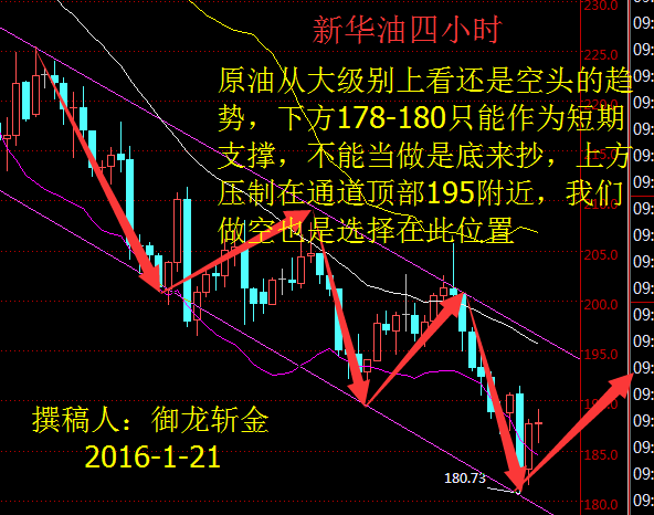 【消息面】 周三(1月20日)全球股市下挫使得市場的避險情緒激增,但美元指數卻在動蕩的金融市場環境中明哲保身暫時震蕩。由于市場密切關注歐洲央行在周四的決議,投資者對歐元兌美元十分謹慎,不愿意大量交投。不過,現貨金價卻在動蕩的市場環境中收益,而原油價格卻始終看不到陽光,并在周三的交投中再度創下十二年新低。雖然此后的空頭回補一度扳回了大部分跌幅,但大增的API庫存數據卻再度剝奪了油價回升一絲希望。 暖和天氣與供應增加: 國際能源署(IEA)在月度報告中稱,反常的暖和天氣與供應增加將令原油市場維持供應過剩,這一局面至少將持續至2016年后期。數據顯示,2015年第四季期間,由于全球冬季氣候偏暖,使全球石油日需求增幅降至100萬桶的一年低點,亦低于第三季創下的近五年高位每日210萬桶。IEA預期今年需求增速將從2015年的170萬桶/天放緩至120萬桶/天,平均需求料為9570萬桶/天。 【1.21原油技術分析】 昨日開盤即顯弱勢,直接破低下行。分析日圖還是缺少止跌信號。每次的反彈都是立即轉陰回落,到目前還未出現過日圖雙陽的反彈延續,可見短期還處于下跌趨勢之中。雖然要防止反抽,但是穩健仍需等待止跌回穩的信號才能考慮多單,否則顯得較為被動。短線圖沖高回落收低,有節奏式的震蕩臺階下跌。昨日亞盤就直接刷低,但是通常亞盤走低,延續的空間不會太大。所以暫時不去追空。 今日原油從四小時圖來看,均線系統總體呈空頭向下排列并且短期均線向下聚攏K線價格在均線下方運行,K線在布林中軌下方運行,預期后期價格將持續向下運行,御龍建議今天操作反彈做空,考慮市場心理原因,雖然依舊以高空為主,但做單要嚴格止損,密切關注趨勢動向,以免趨勢轉弱為強,看不清楚方向,觀察日內小時線陰陽線,看看日內陰陽轉換狀況,然后確立強弱,做跟隨。上方關注196壓力!下方關注180支撐! 【1.21原油操作建議】 1、192-194附近空,目標183,止損195上方 2、178-180附近多,目標188,止損175下方 3、以上原油行情分析及操作策略是以新華油為準,其它交易平臺在線指導請咨詢筆者御龍斬金。 【1.21瀝青技術分析】 日線圖上看,下方受到布林帶下軌一線支撐;指標上看均線空頭排列,MA5/MA10死叉放量,整體行情受阻于MA5的強勢壓制,附圖MACD指標綠色動能減弱,死叉運行于0軸下方,KDJ隨機指標超賣運行,有聚集向上發散; 4小時圖上看,瀝青整體趨勢趨于弱勢。K線形態上看日內有一波反彈,但幅度不會太大,指標上看油價運行于布林帶中軌下方,均線指標上看,MA5/MA10死叉向下運行;附圖MACD指標紅色動能放量,交金叉運行于0軸下方,指標弱勢; 【1.21瀝青操作建議】 1、瀝青反彈1450-1460一線做空,止損1490-1500,目標看1400-1380; 2、瀝青回調1380-1400一線輕倉做多,止損1350,目標看1420-1450; 3、以上瀝青行情分析及操作策略是以華夏瀝青為準,其它交易平臺在線指導請咨詢筆者御龍斬金。 【1.21白銀技術分析】 白銀價格昨日依托MA5均線震蕩上行,從日線上看,布林帶繼續持平,K線運行于布林帶中軌上方,上方反彈受布林帶上軌壓制,下方布林帶中軌位置為其提供短期支撐,其短中期均線于2950-3000區間密集運行,附圖指標MACD于0軸一帶運行,指標中性偏強,短期來看,白銀價格將繼續維持區間震蕩格局;從4小時上看,布林帶小幅縮口,K線位于布林帶中軌附近,附圖指標MACD于0軸上方金叉發展,指標偏強;綜合來看,御龍建議白銀日內繼續以逢低做多對待。 【1.21白銀操作建議】 1、3000-3020做空,止損40個點,目標2960-2940。 2、2950-2960做多,止損40個點,目標3000-3010。 3、以上白銀行情分析及操作策略是以華夏銀為準,其它交易平臺在線指導請咨詢筆者御龍斬金。 【御龍斬金團隊服務宗旨】 ①優質服務:我們用最專業的知識,最優質的“一對一”為你服務。 ②喊單服務:我們有業內最精英的分析團隊全天實時在線行情分析,指導操作。 ③軟件服務:專業的技術實盤分析軟件報價與國際實時接軌。 ④資金服務:資金由銀行第三方存管,安全放心。 |