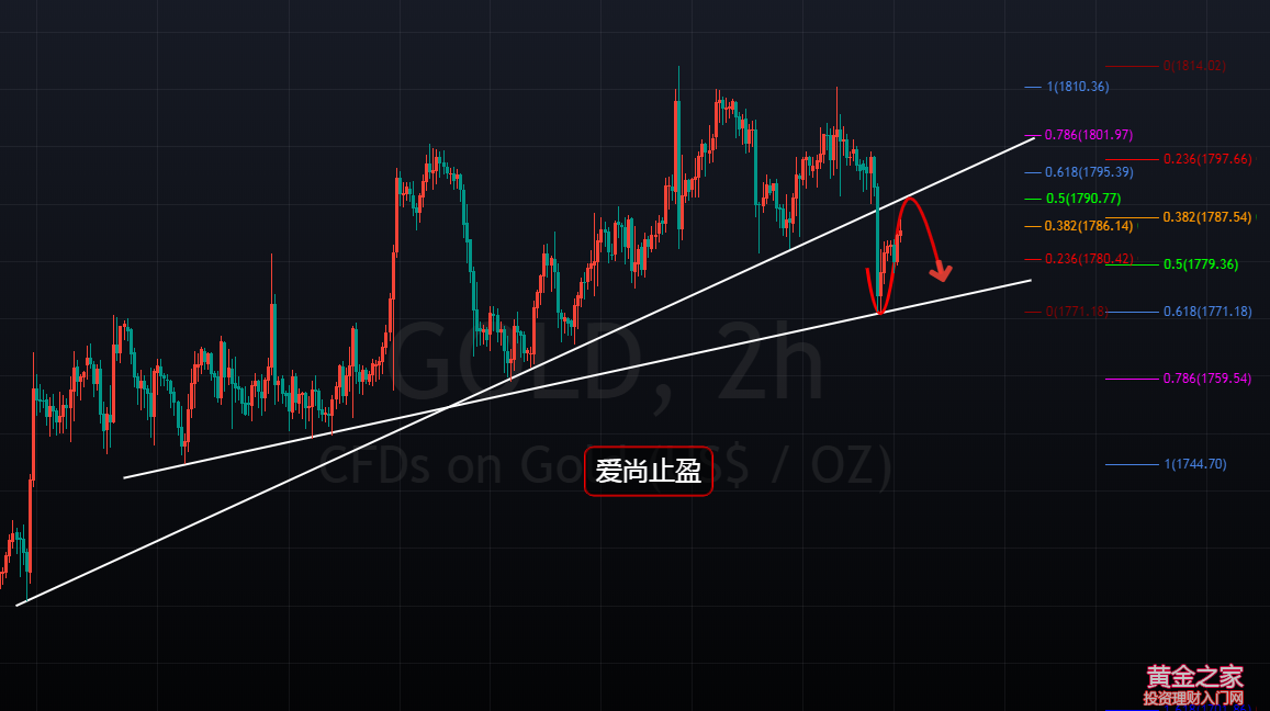黃金,在上周四沖擊1813高點未破,觸及4小時級別趨勢線壓制點1810后走回落,彰顯出此壓力位的有效性;而美指,在同一時段觸及了日線級別趨勢線支撐點,也就預示著黃金短期將面臨調整,那么,周五黃金,就需以逢高做空為主,特別是在跌破4小時趨勢線支撐1788后,任何的反抽,都是給我們做空的機會,這也是我們在周五反復做空的因素之一,當然啦,這段時間沒寫分析,也沒公布思路。周五晚間,黃金最低觸及1771后,受到4小時級趨勢線支撐及1745-1813反抽回撤的0.618支撐開始反彈整理收盤,周線方面最終收取一根上影線較長的紡錘形態,這種形態收線后,日內黃金還需看空。 當前,黃金小幅突破周五凌晨高點及頂底轉換位1783,突破此位后,短期金價還有反彈的需求,上方阻力關注4小時上升趨勢線反壓力位1790-91,此位也是日線5日均線壓制及此輪回撤反抽50%的阻力位,午后黃金,觸及1790附近空,主要看歐盤強弱,歐盤黃金若能跌破早間起漲點1779,美盤應該還有一跌,強支撐繼續關注周五晚間低點1771;若歐盤黃金有效突破并站穩1791,空單回撤后就需調倉出局,美盤再另行安排。 操作建議: 1790附近空,止損1795.目標看1780-75 |