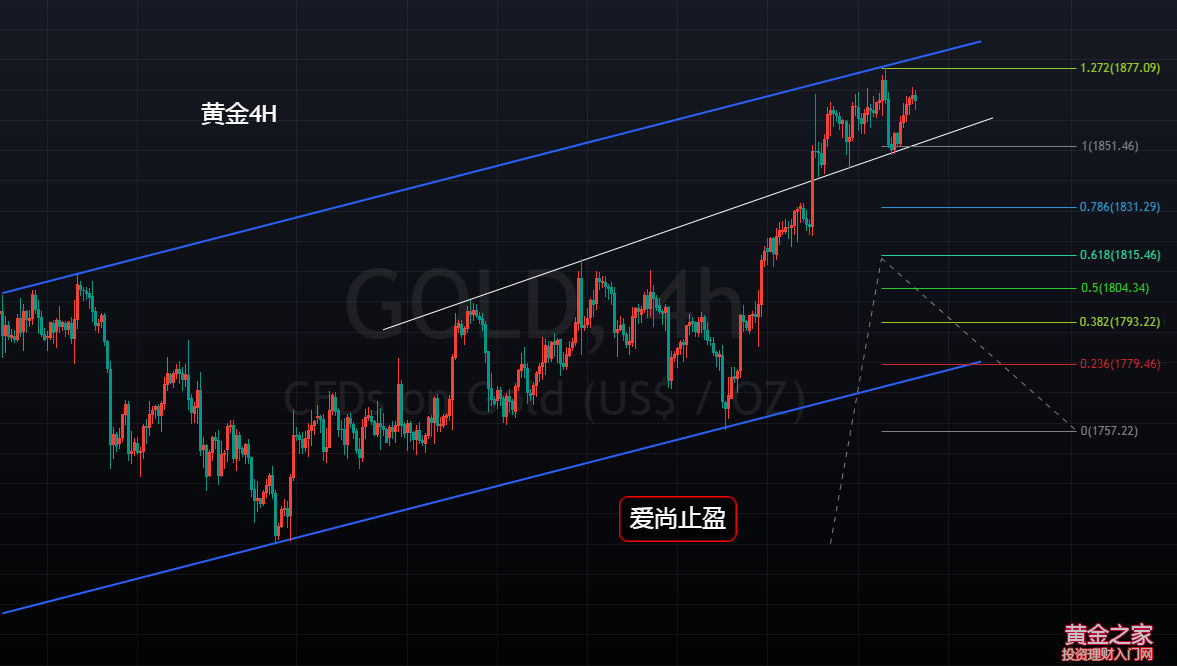 黃金,在月初回踩1759支撐后開(kāi)始一路連陽(yáng)上升,上周強(qiáng)勢(shì)突破日線雙頂壓制1834后,金價(jià)一直處于1840之上高位震蕩修正,周二金價(jià)在觸及1877一線后,受到4小時(shí)上升通道上軌壓制后展開(kāi)回落,周三在觸及4小時(shí)上升趨勢(shì)線支撐1849后拉升,當(dāng)前金價(jià)再次來(lái)到1870附近,此輪多頭,近120美金的漲幅,價(jià)格也觸及日線級(jí)別的關(guān)鍵阻力位附近,至于浪3是否結(jié)束,這里還是得打一個(gè)問(wèn)號(hào),對(duì)于交易而言,肯定是不建議在高位接多,黃金隨時(shí)都可能迎來(lái)浪4的調(diào)整,別為了芝麻丟了西瓜。 1680-1834,日線級(jí)別浪1的第一波上升,154美金的漲幅;1721-1877,日線級(jí)別浪3的上升浪,156美金的漲幅,就幅度而言,符合AB=CD形態(tài),但在時(shí)間周期上,相差了近一倍,對(duì)于日線級(jí)別AB=CD做空形態(tài)而言,持保守觀望的態(tài)度;細(xì)分到4小時(shí),如果把1721視為浪1的起點(diǎn),1721-1813有92美金的漲幅,而浪3的起點(diǎn)1759到目前的高點(diǎn)1877有118美金的漲幅,用斐波那契擴(kuò)展我們可以計(jì)算出當(dāng)前的高點(diǎn)1877一線剛好是浪1的1.27倍,幅度符合AB=CD形態(tài)里的變形形態(tài),但同樣,在時(shí)間周期上存在差異,所以,對(duì)于浪3是否見(jiàn)頂,還是有爭(zhēng)議,但日線已經(jīng)形成了Gartley做空形態(tài),日線級(jí)別,已經(jīng)符合做空的條件,1877也將有望成為短期階段性的高點(diǎn)。 1877一線,也是4小時(shí)上升通道上軌壓制,金價(jià)在觸及此位后走了一波有效回撤,彰顯出此壓力位的有效性,而此輪的回撤也使得日線在周二收取了一根上影線極長(zhǎng)的大陰,配合前一個(gè)交易日收取的吊頸線,短期黃金有見(jiàn)頂?shù)嫩E象,所以,今日黃金,可以依托1877阻力位去嘗試波段空單,上破1878止損出局即可,下方短期支撐關(guān)注4小時(shí)趨勢(shì)線支撐及昨日低點(diǎn)1852-49,強(qiáng)支撐關(guān)注此輪上升回撤的0.382支撐1832,此位也是本月的多空分水嶺,本周首次觸及1832附近可以多一次,若有效跌破1832支撐,波段空頭將有望成立,第一目標(biāo)將看至1800區(qū)域。 操作建議: 1870附近空,止損1878,短期目標(biāo)看1860-50-32,中期目標(biāo)1800 |