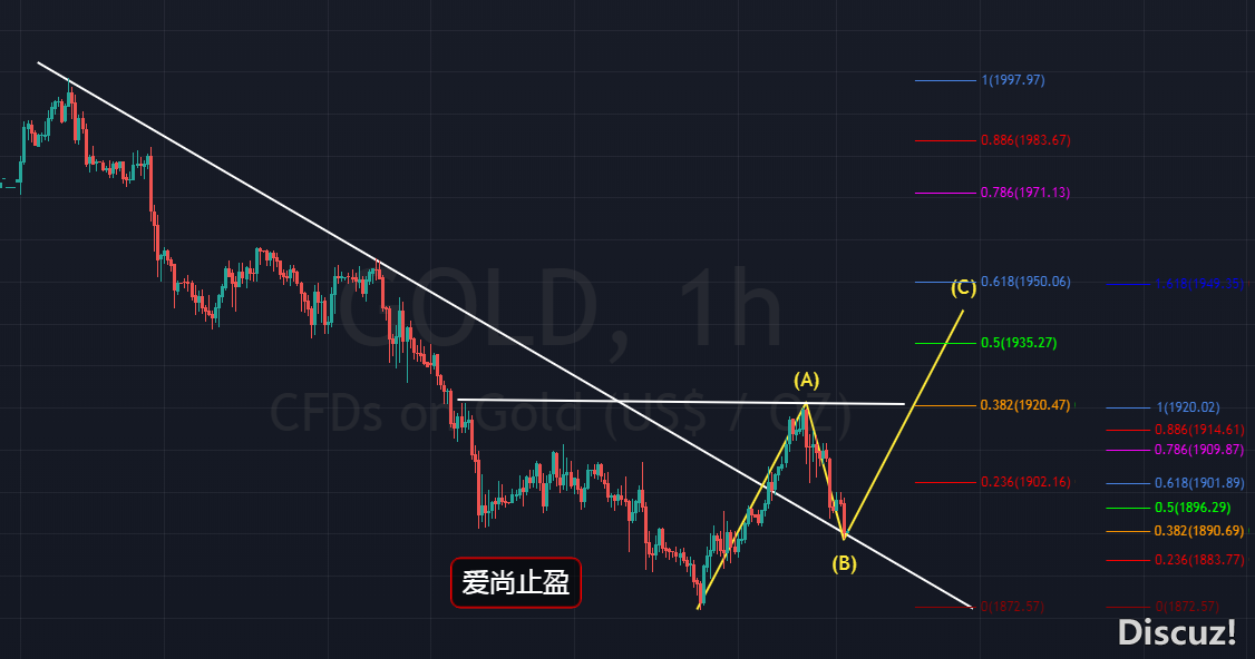 黃金,在上周三凌晨的時候,我們在1883附近減倉了4月中旬給出的1980-2000區域的波段空單,周四的分析中也是明確指出,黃金在1875-78區域做多看反抽,價格如果突破小時線趨勢線壓力位,金價將延續上升,周五黃金在突破趨勢線壓力位后,歐盤一路延續慢漲,在美盤前觸及1920附近壓力位后開始走回落,我們也是提前給出的了黃金1919.5掛空單的建議,空單掛單如期成交,一不小心就拿下了周五最高點的空單,美盤時段,也是特別提示了,白天慢漲殺空,晚上可能就要斬多頭了,所以,美盤時段,黃金回撤后我們并沒有參考這個多單,十點后,金價依舊沒有突破歐盤高點1920,也就預示著晚上破高的概率非常小了,所以,我們在1913附近加倉做空,凌晨后,金價開始震蕩下行,最低觸及1894附近后震蕩整理收盤,日線最終收取一根上影線極長的倒錘頭,周線收取一根下影線極長的大陰線,趨勢上,黃金依舊還是空頭,但短期而言,先看止跌反抽。 自1998下跌以來,這波5浪下跌結構已經基本完成,接下來,就是看反彈修正了,等修正完成繼續空即可。如果1872-1920視為浪A反抽,那么,1920-目前的下跌,就是走B浪回調,今日黃金,則等B浪回調完成后,繼續看C浪上升,結構上還是比較清晰的,那么,周初黃金,我們還是先以回撤做多為主。日內黃金,下方支撐關注1890附近,此位是1872-1920反抽回撤的618支撐,也是前期左側的頂底轉換位及趨勢線反支撐位,日內黃金,觸及1890附近先多,強支撐在1881,如果你是玩短線,止損放1885即可,小止損博弈,如果能拿住單子,止損可以放在1880作為多頭的防守位,看C浪上升,上方短期壓力關注周五美盤回撤的低點1902,進一步壓力關注周五凌晨的開跌口1913-2。這波行情若能C浪上升,至少會突破周五的高點1920,強壓力位在1950附近,此位也是后期繼續博弈空頭的關鍵壓力位。 操作建議: 1890附近多,止損1880,目標看1900-1910-35-50 |