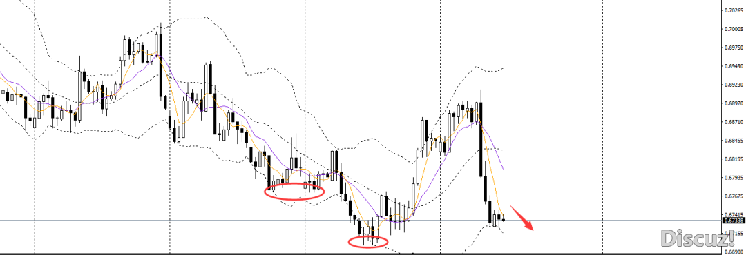 AUDUSD 澳美大跌近200點,逼近前低,日線整體格局仍偏空,0.6760,0.68一線可繼續等待承壓做空的機會。添加V=jxh2357 Q=3129466676 公眾號=蔣鑫鴻