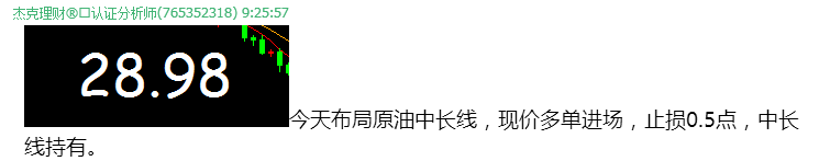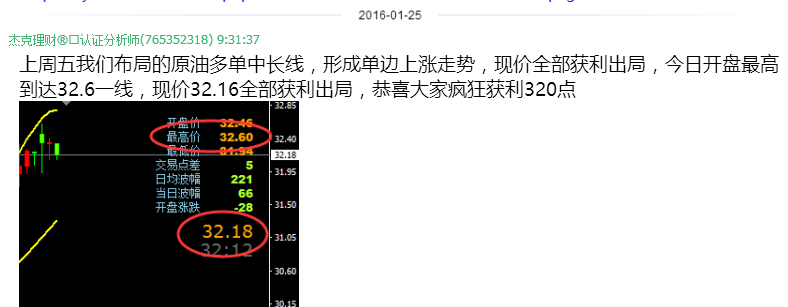 | 窮人總是喜歡做夢,富人一直不斷行動,而機會總在猶豫不決中慢慢流失。這里有最扎實的技術,也有最人性的服務。只要你嚴格執行做單策略,操作就是如此簡單。 誠信雙贏 互惠互利。在這里,你會得到意想不到的收獲。跟對單贏一次,跟對人贏一世,先再合作,我們實力說話,準確率92%以上,專業的經紀人比的是穩定,專業,服務態度。穩健盈利才能真正實現財富翻倍。 黃金今日未給出實盤單 原油今日 一單 |