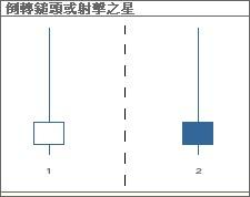 股市術語,反映逆轉的燭臺[燭臺圖表的價格模式,該模式形成一個錘頭形狀的燭臺。之前股價處于高位,燭身很大。發生射擊之星現象的當天開盤價(通常情況下)將高于前一天的收盤價,之后股價攀升到高點,但最后以低于開盤價的價格收盤。