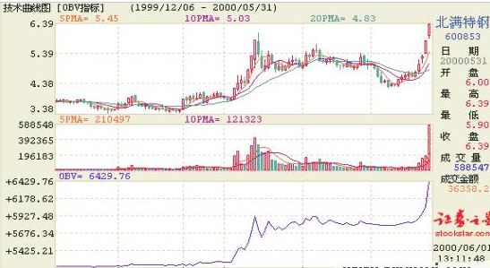 另外,漲跌停板的股票也會導致指標失真。由于內地股市采用了漲跌停板的限制,很多股票在連續漲停的時候,由于股民預期后市會繼續大漲,往往會持股觀望,導致出現越漲越無量的現象。因此,對于那些達到漲跌停板的股票,OBV指標也無**常發揮作用。