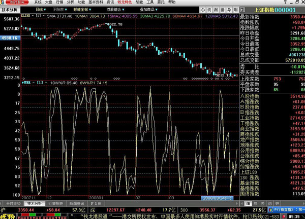 2、從威廉指標(biāo)的計算公式看,基期n值的數(shù)值選擇非常關(guān)鍵。n值確立后,代表了研究周期的選定,n值越小,威廉指標(biāo)波動頻率越快,把握價格變化的靈敏度就越高,但據(jù)此操作投資者易陷入頻繁操作的誤圈,偶然因素的影響也會加大投資者對現(xiàn)有市場的判斷出錯;n值越大,威廉指標(biāo)波動頻率越慢,價格變化的靈敏度降低,偶然因素對價格趨勢的影響降低。筆者對威廉指標(biāo)作了5年的長期跟蹤并結(jié)合時間之窗對價格趨勢的影響,淺顯認(rèn)為威廉指標(biāo)可按短、中、長選取參數(shù),短期n值選10為宜,中期選20,長期選89。這樣威廉指標(biāo)在5分鐘、15分鐘、30分鐘、60分鐘、日線、周線、月線圖上均表現(xiàn)為3條威廉指標(biāo)線,分別代表了短、中、長的擺動趨勢。